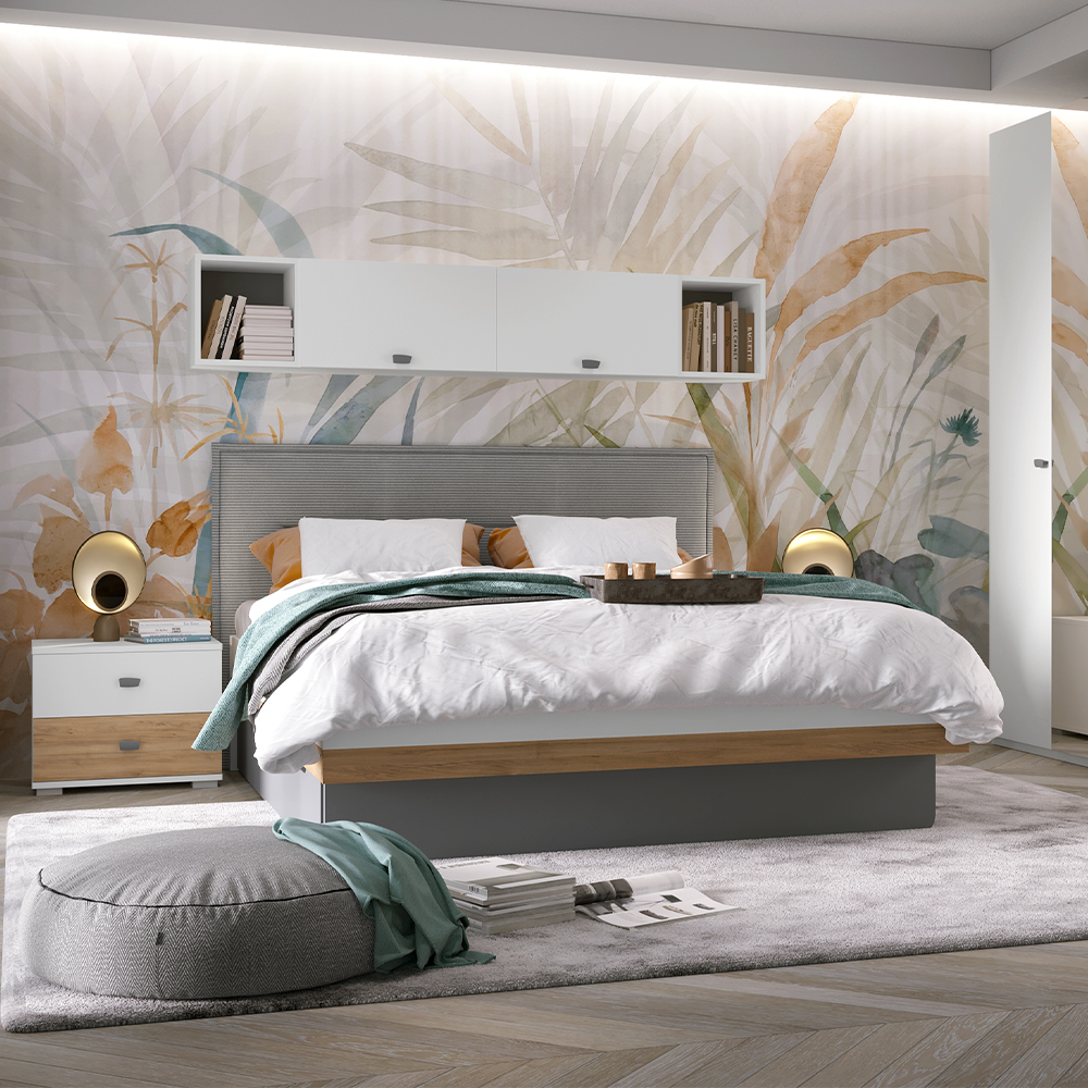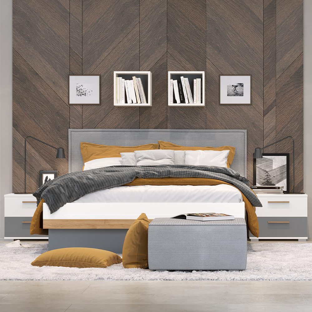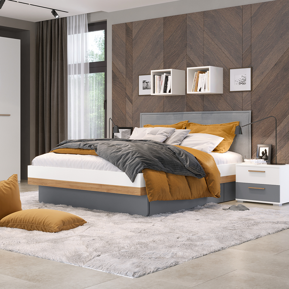 - konstrukcija kreveta izrađena u kombinaciji soft mat laka u beloj boji, drvo-dekora Pacific orah sa nogom u tamno sivoj boji