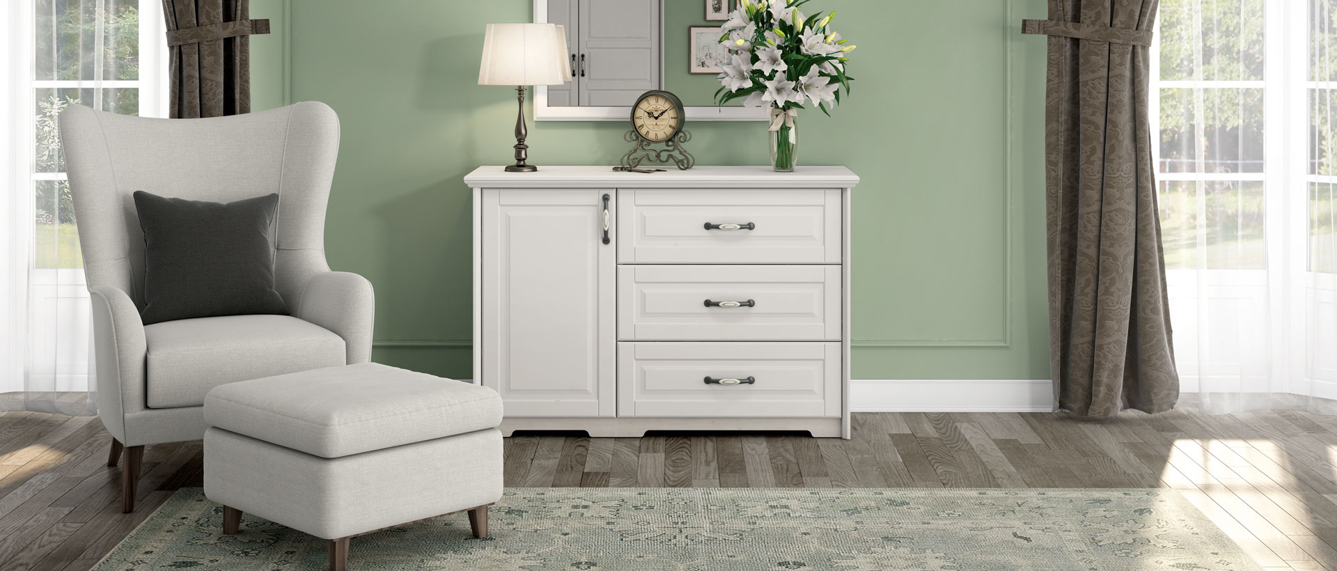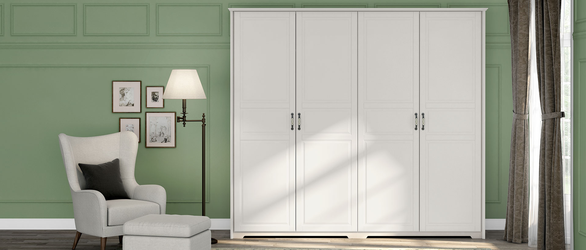 Spavaća soba Evergreen od medijapana u kombinaciji tople boje slonove kosti i dekora polarnog bora
