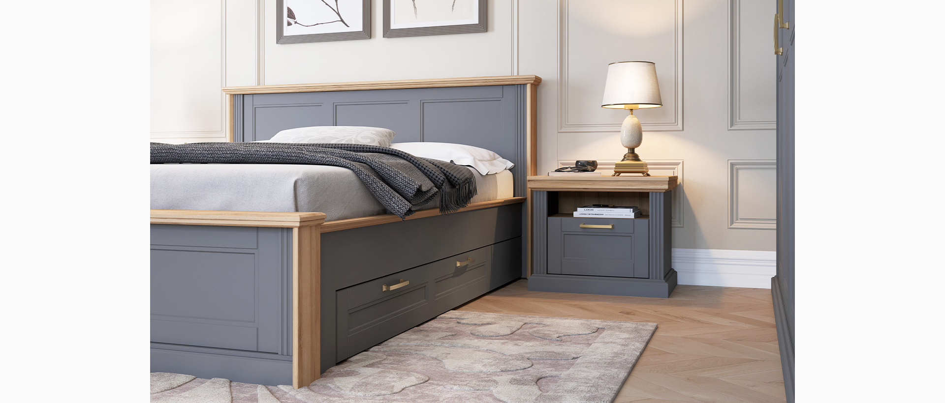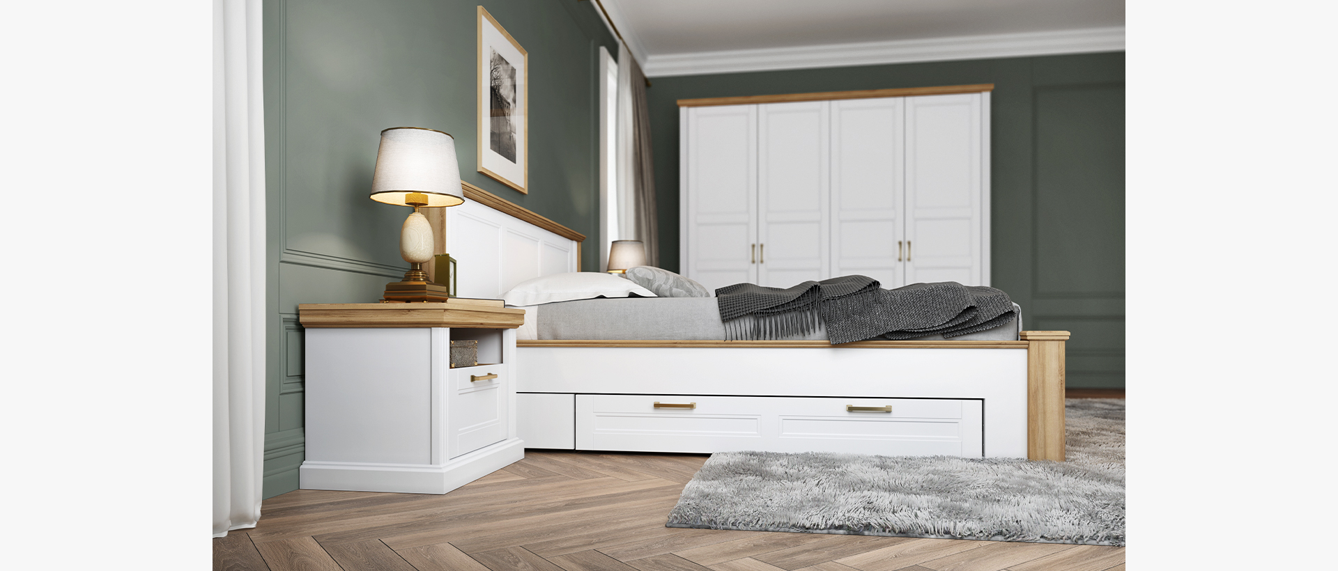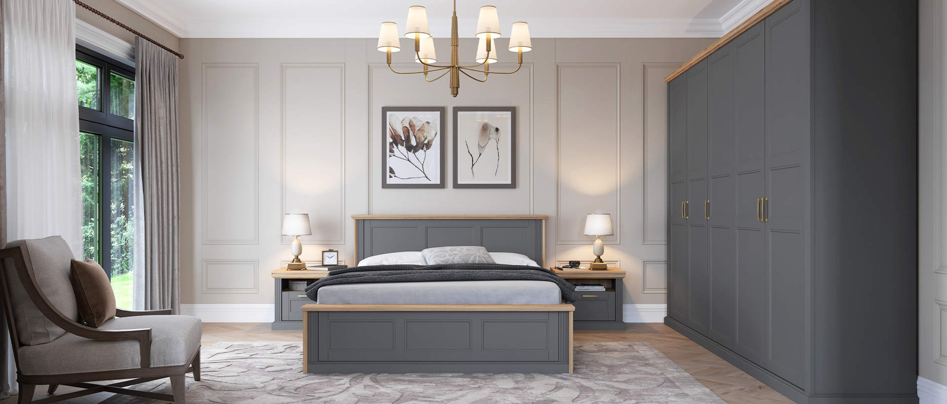 Spavaća soba Tara lakirana UV mat lakom u grafit sivoj ili beloj boji u kombinaciji sa drvo dekorom Pacifik orah