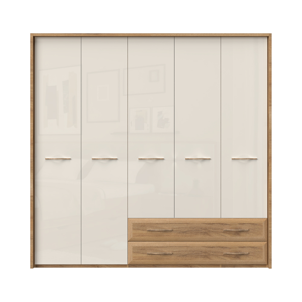 Funkcionalni plakar za spavaću sobu‚ iz kolekcije GALA jake geometrijske forme. Ovaj element nameštaja sadrži pet krila i dve fioke.
