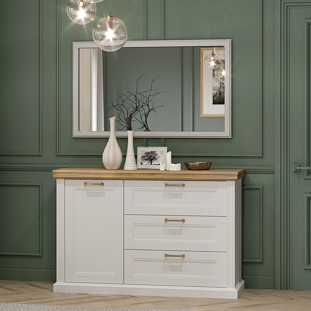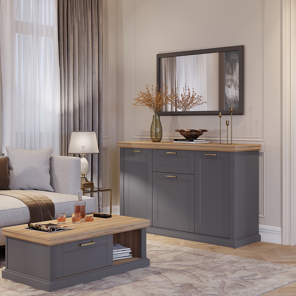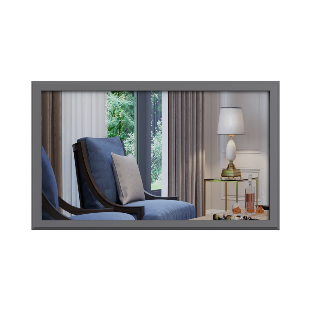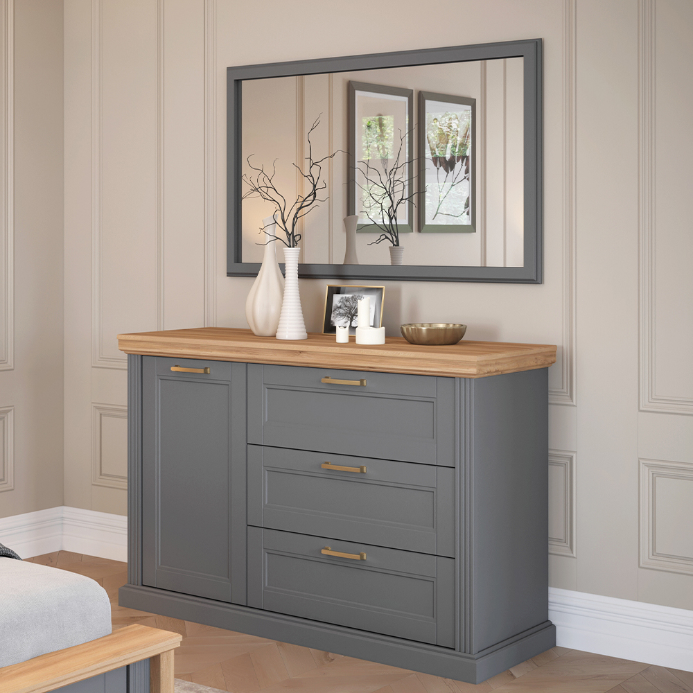 Ogledalo iz kolekcije TARA, sa ramom od stilski profilisanih lajsni izrađenih od medijapana kompletno lakiranog UV lakom sa soft mat efektom u grafit ili beloj boji i masivnom pokrivnom pločom u dekoru Pacifik orah .