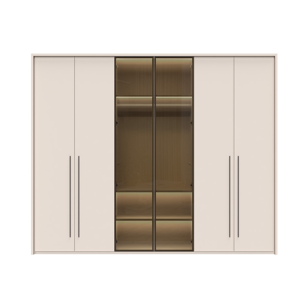 Šestokrilni plakar sa dekorativnim lajsnama sa četiri krila lakirana soft mat UV lakom u boji Kašmir i dva staklena fronta iz kolekcije OPERA.