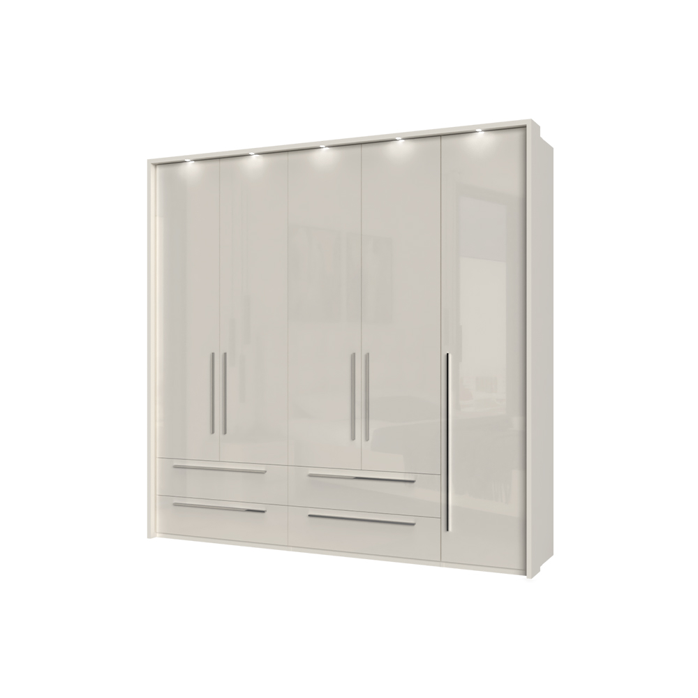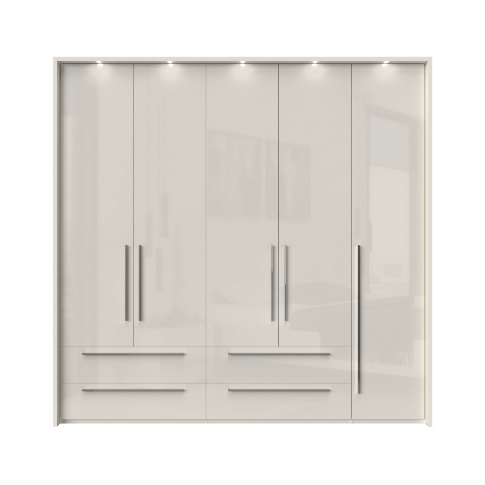 Funkcionalni plakar sa pet krila i četiri fioke sa dekorativnom bočnom i pokrivnom lajsnom sa rasvetom iz kolekcije nameštaja PIANO.