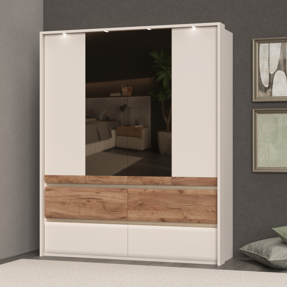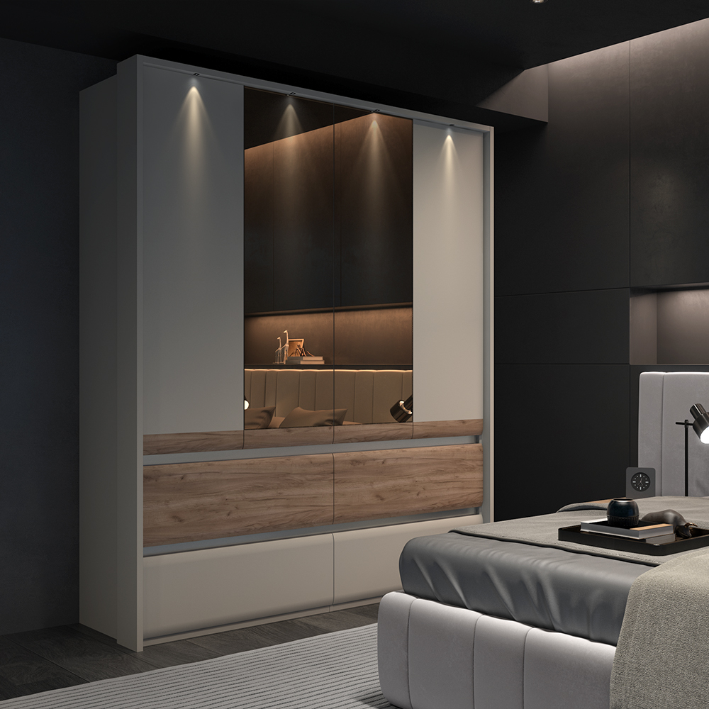 Plakar za spavaću sobu iz prestižne kolekcije INVICTUS sa četiri krila, od kojih su dva sa ogledalima i četiri fioke skladne i meke forme frontova.