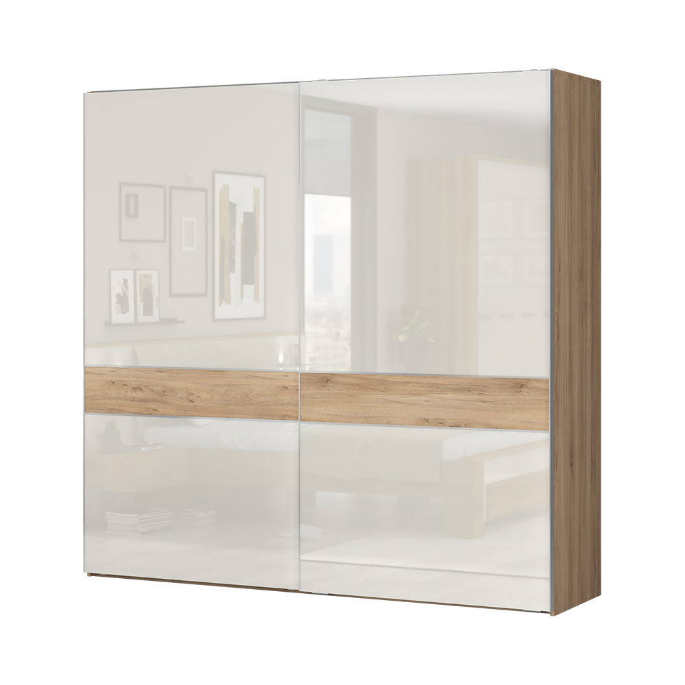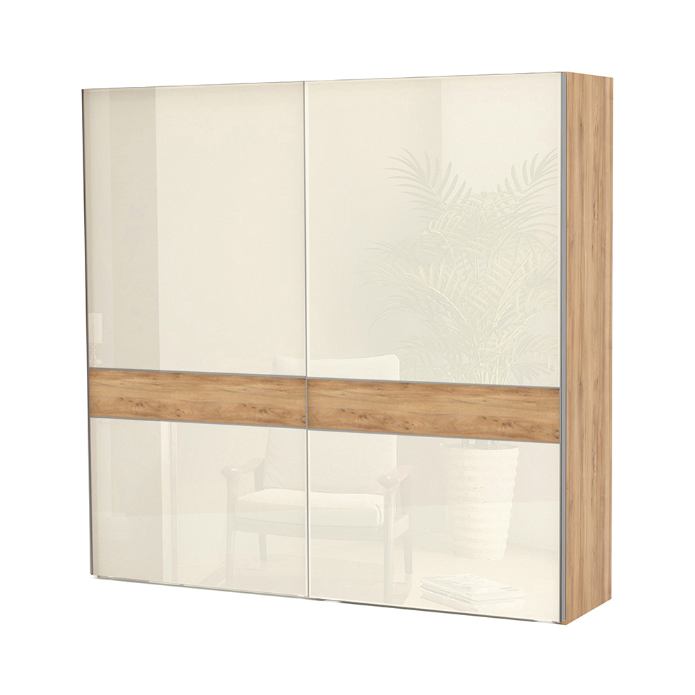 Klizni plakar za spavaću sobu, iz kolekcije GALA, snažne geometrijske forme sa dva puna krila koja imaju aplikaciju u drvo-dekoru.