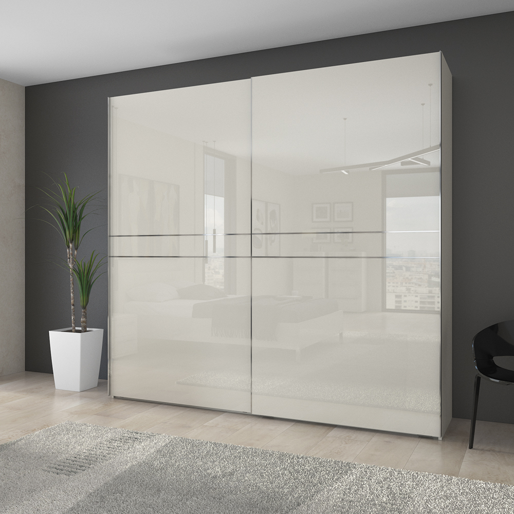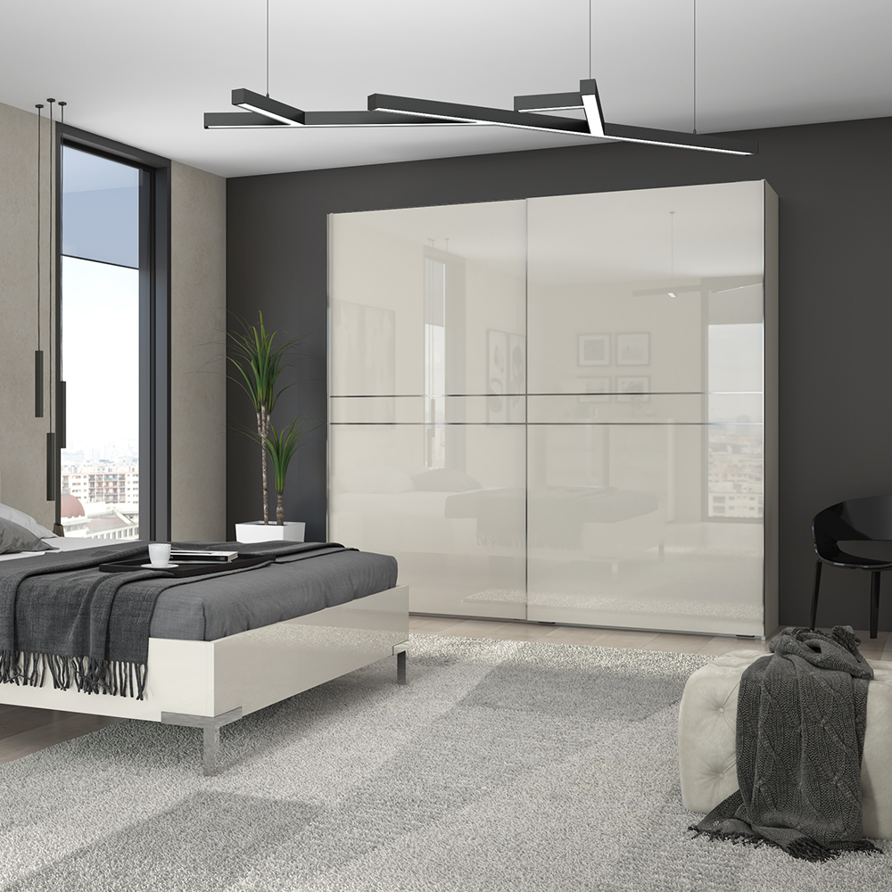 • frontovi i bočne strane plakara lakirani su UV lakom u visokom sjaju, u toploj bež boji u kombinaciji sa elegantnim horizontalnim hromiranim lajsnama;