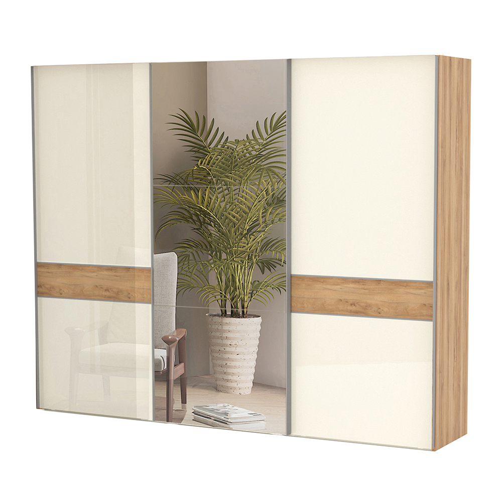 Klizni plakar za spavaću sobu, iz kolekcije GALA, snažne geometrijske forme sa tri puna krila, od kojih dva imaju aplikaciju u drvo-dekoru, a treće je prekriveno ogledalom.