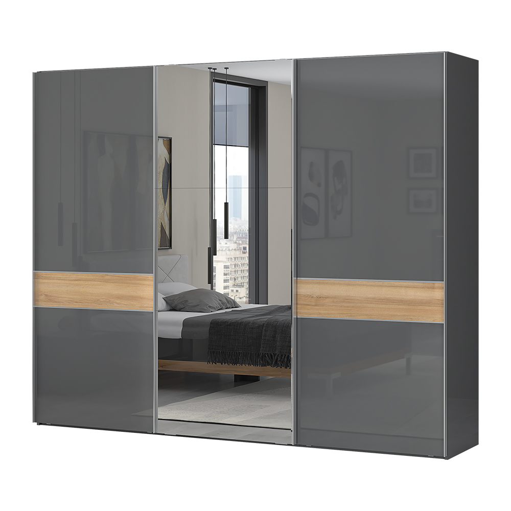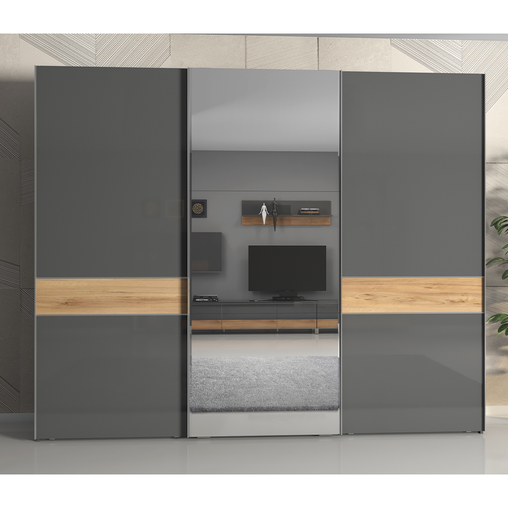 Trokrilni klizni plakar sa ogledalom na jednom krilu, modernog dizajna i minimalističke forme.