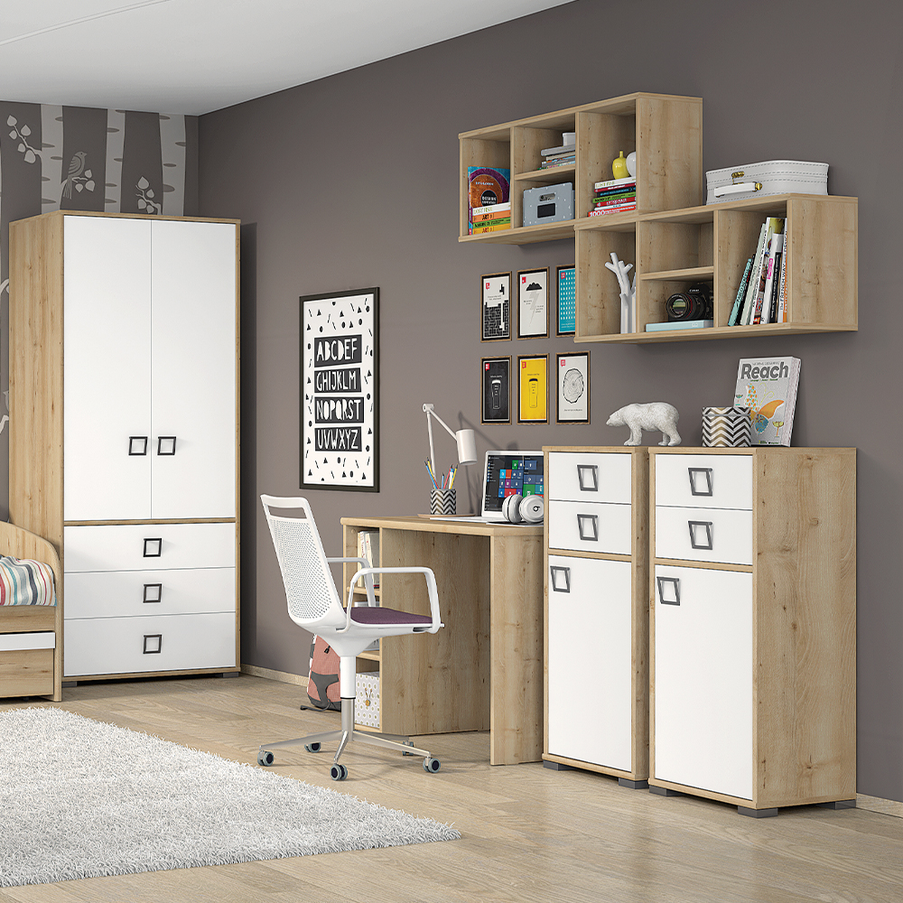 Ormarić za dečiju sobu, sa jednim krilom i dve fioke, iz kolekcije KIKI. Element je moguće montirati prema vašim potrebama. Nameštaj koji se svojim kvalitetom i funkcionalnošću u potpunosti izdvaja od ostalih na tržištu