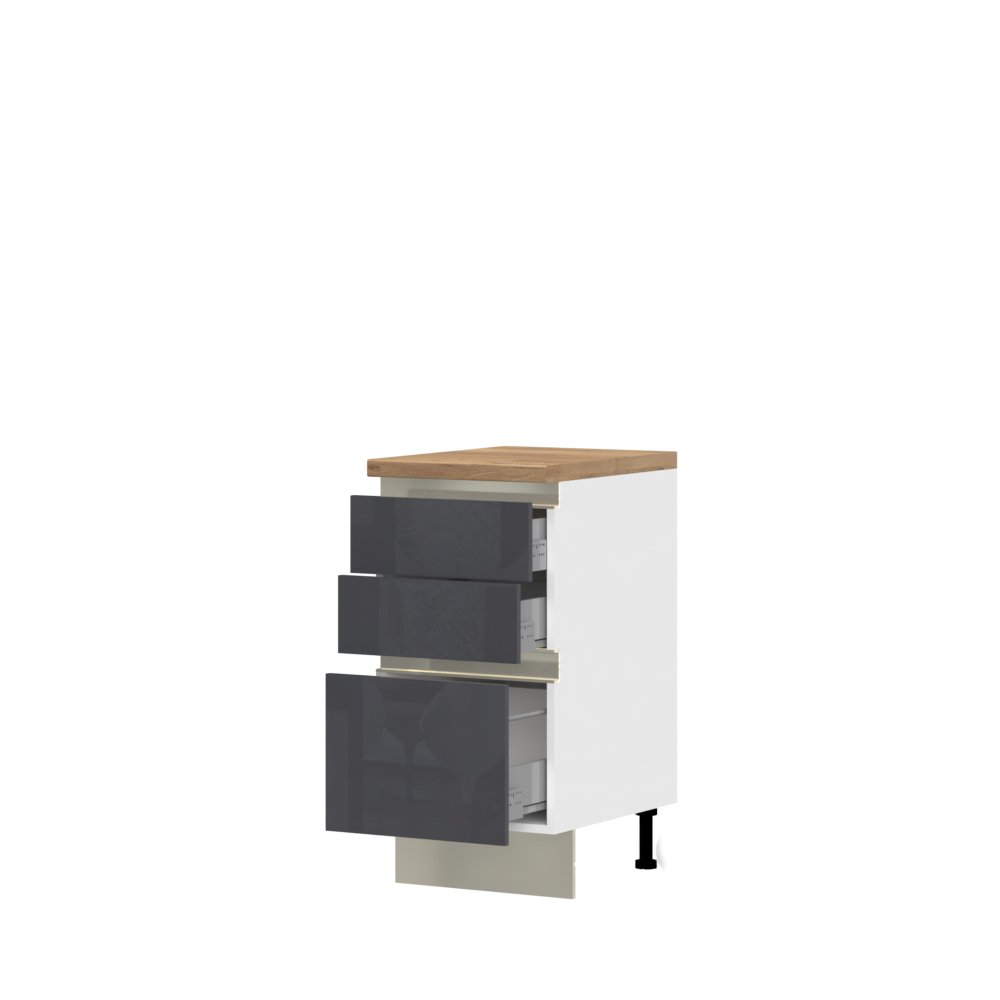 Radni kuhinjski element sa tri metal-box fioke sa punim izvlačenjem, čija je nosivost do 30 kilograma, širine 45 cm.