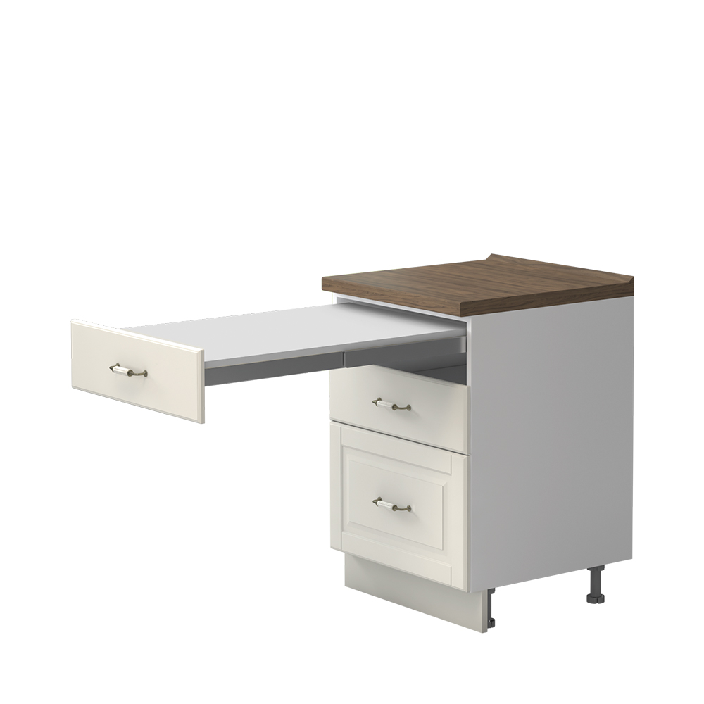 Radni kuhinjski element sa metal-box fiokama i dodatnim stolom, širine 60 cm. Element ima dve metal-box fioke sa punim izvlačenjem, nosivosti 30 kg, a u trećoj se nalazi klizni mehanizam sa pomoćnom radnom površinom.