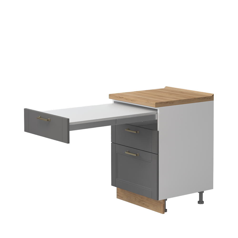 Radni kuhinjski element sa metal-box fiokama i dodatnim stolom, širine 60 cm. Element ima dve metal-box fioke sa punim izvlačenjem, nosivosti 30 kg, a u trećoj se nalazi klizni mehanizam sa pomoćnom radnom površinom.