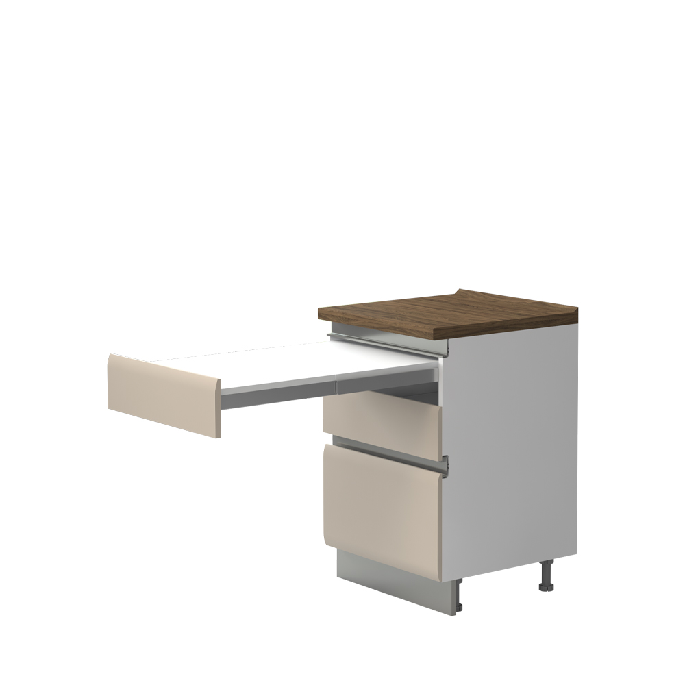 Radni kuhinjski element sa metal-box fiokama i dodatnim stolom, širine 60 cm. Element ima dve metal-box fioke sa punim izvlačenjem, nosivosti 30 kg, a u trećoj se nalazi klizni mehanizam sa pomoćnom radnom površinom.