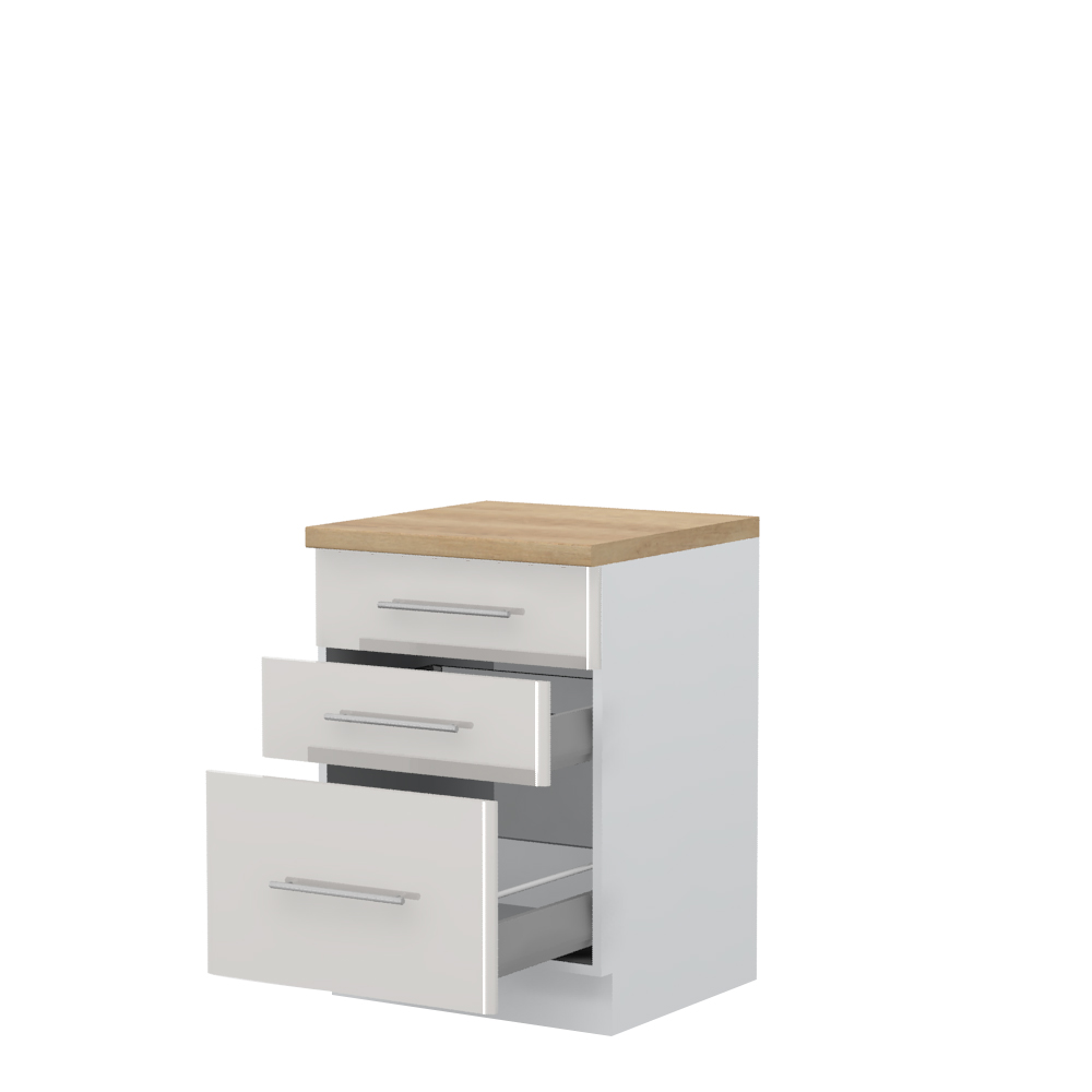 Radni kuhinjski element sa tri metal-box fioke sa punim izvlačenjem, čija je nosivost do 30 kilograma, širine 60 cm.