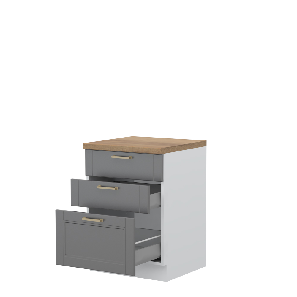 Radni kuhinjski element sa tri metal-box fioke sa punim izvlačenjem, čija je nosivost do 30 kilograma, širine 60 cm.