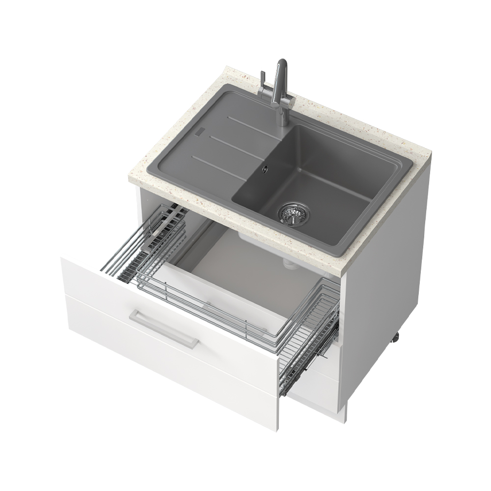 Radni kuhinjski element sa dve fioke sa punim izvlačenjem, širine 80 cm. Ugradnjom ovog elementa omogućuje se maksimalno iskorišćenje prostora ispod sudopere. Jedna fioka sadrži hromiranu žičanu korpu čiji je oblik prilagođen sifonu sudopere, a druga je metal-box fioka nosivosti do 30 kg.