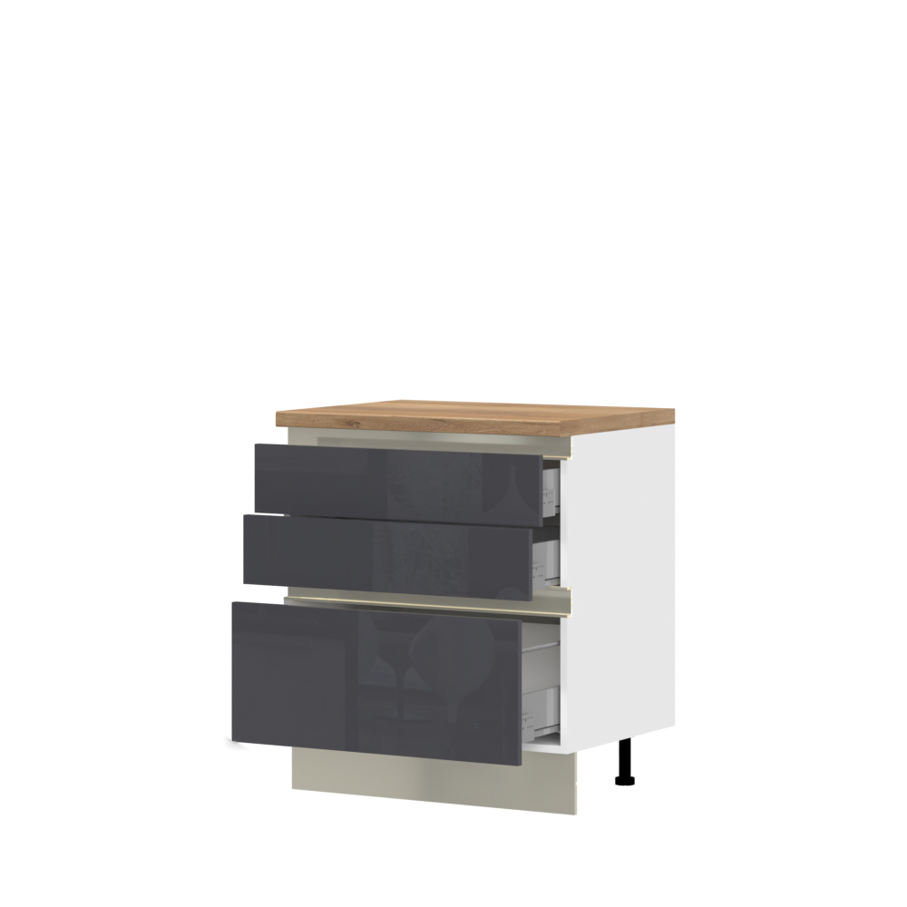 Radni kuhinjski element sa tri metal-box fioke sa punim izvlačenjem, čija je nosivost do 30 kilograma, širine 80 cm.