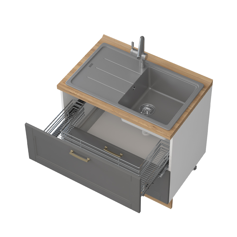 Radni kuhinjski element sa dve fioke sa punim izvlačenjem, širine 90 cm. Ugradnjom ovog elementa omogućuje se maksimalno iskorišćenje prostora ispod sudopere. Jedna fioka sadrži hromiranu žičanu korpu čiji je oblik prilagođen sifonu sudopere, a druga je metal-box fioka nosivosti do 30 kg.
