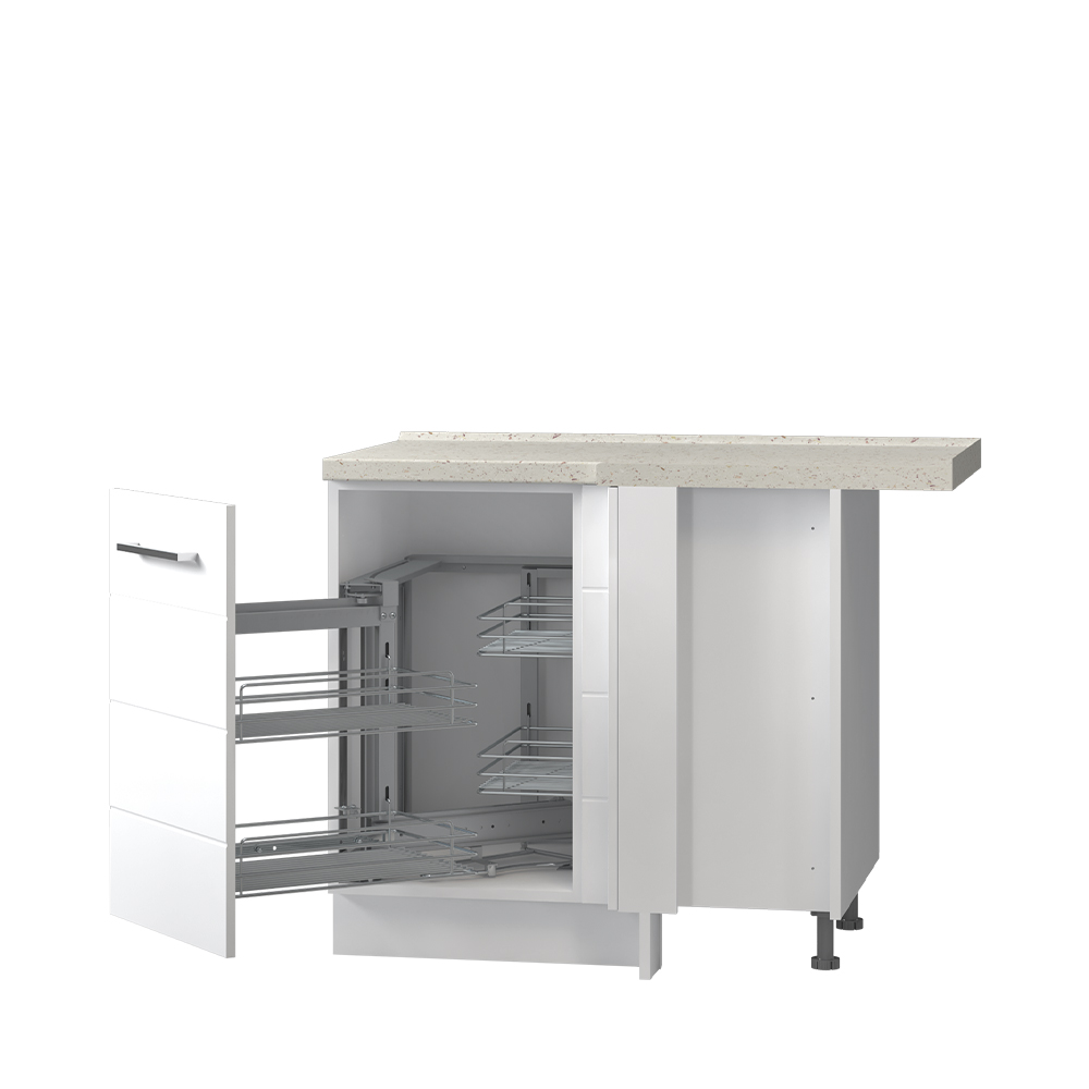 Radni ugaoni kuhinjski element sa jednim krilom i mehanizmom sa hromiranim žičanim korpama za odlaganje. Krilo se otvara na levu stranu.