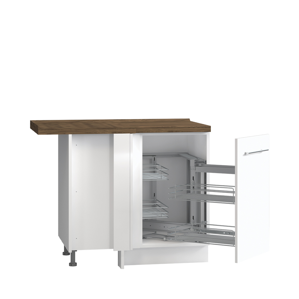 Radni ugaoni kuhinjski element sa jednim krilom i mehanizmom sa hromiranim žičanim korpama za odlaganje. Krilo se otvara na desnu stranu.