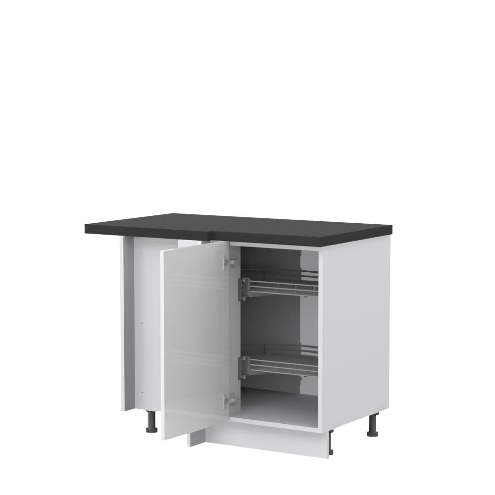 Radni ugaoni kuhinjski element sa jednim krilom i sa dve polukružne hromirane rotirajuće žičane korpe za odlaganje.