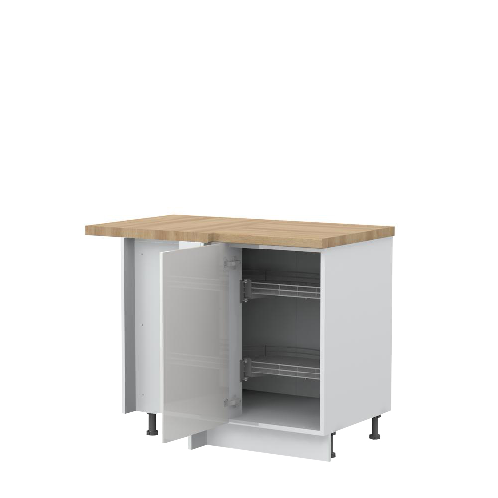 Radni ugaoni kuhinjski element sa jednim krilom i sa dve polukružne hromirane rotirajuće žičane korpe za odlaganje.