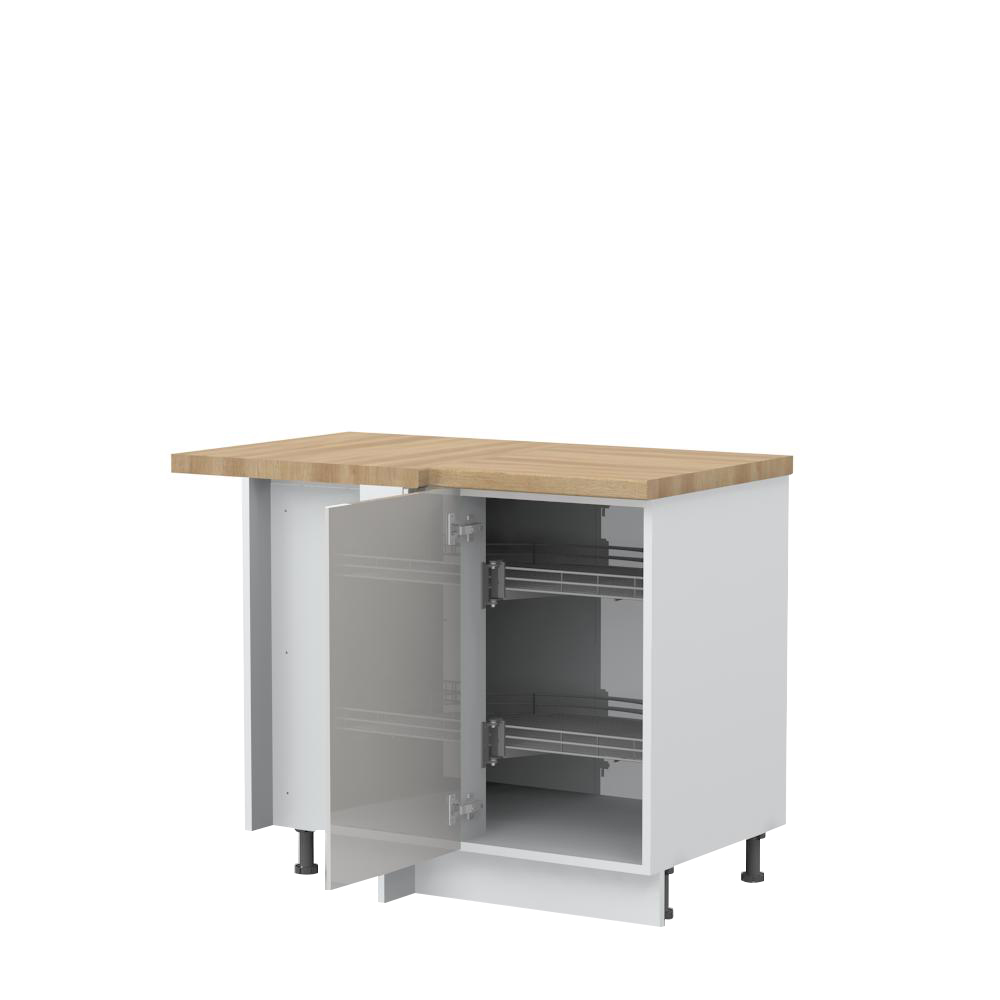 Radni ugaoni kuhinjski element sa jednim krilom i sa dve polukružne hromirane rotirajuće žičane korpe za odlaganje.