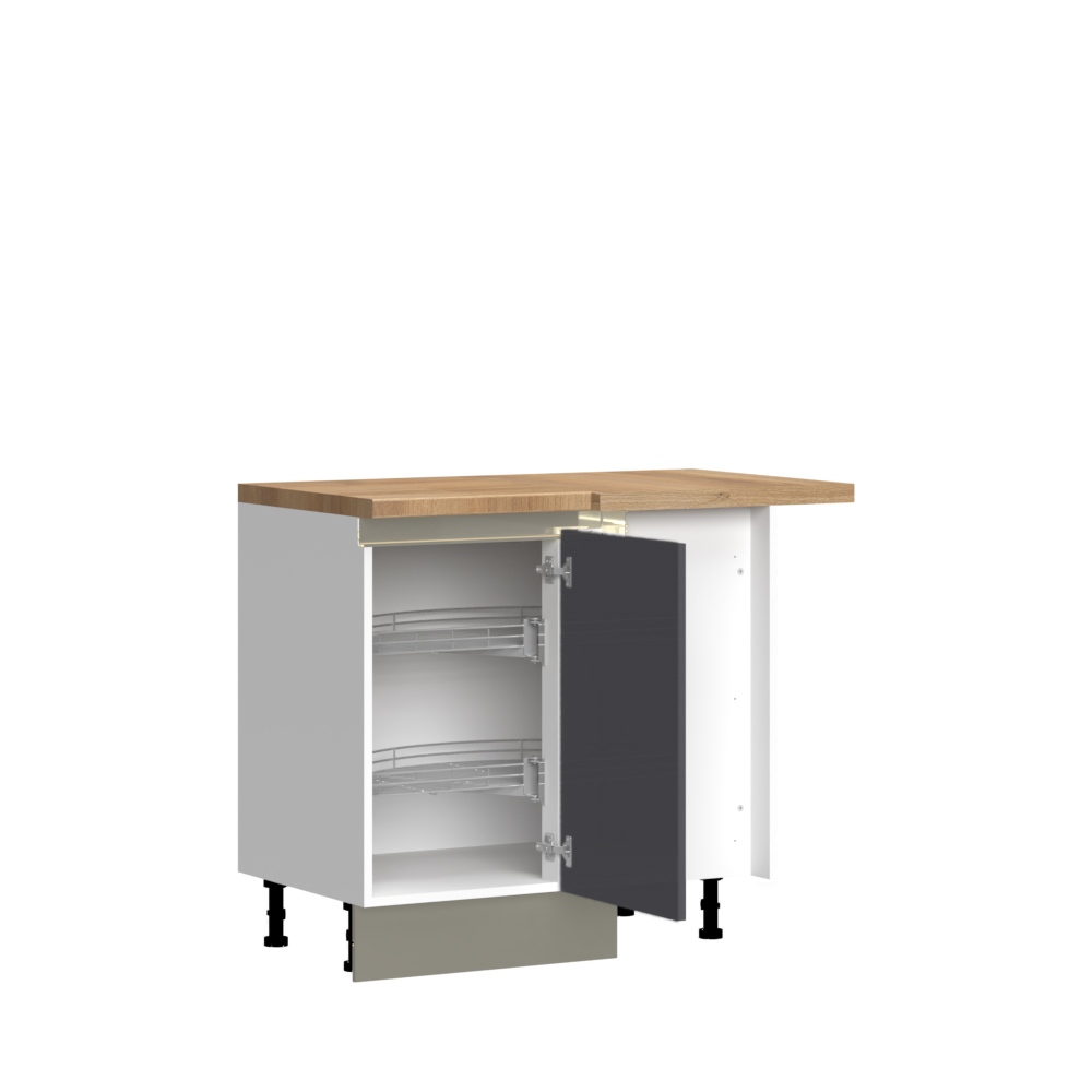 Radni ugaoni kuhinjski element sa jednim krilom i sa dve polukružne hromirane rotirajuće žičane korpe za odlaganje. Krilo se otvara na levu stranu.