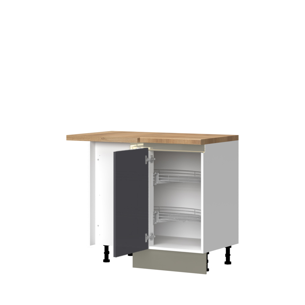 Radni ugaoni kuhinjski element sa jednim krilom i sa dve polukružne hromirane rotirajuće žičane korpe za odlaganje. Krilo se otvara na levu stranu.