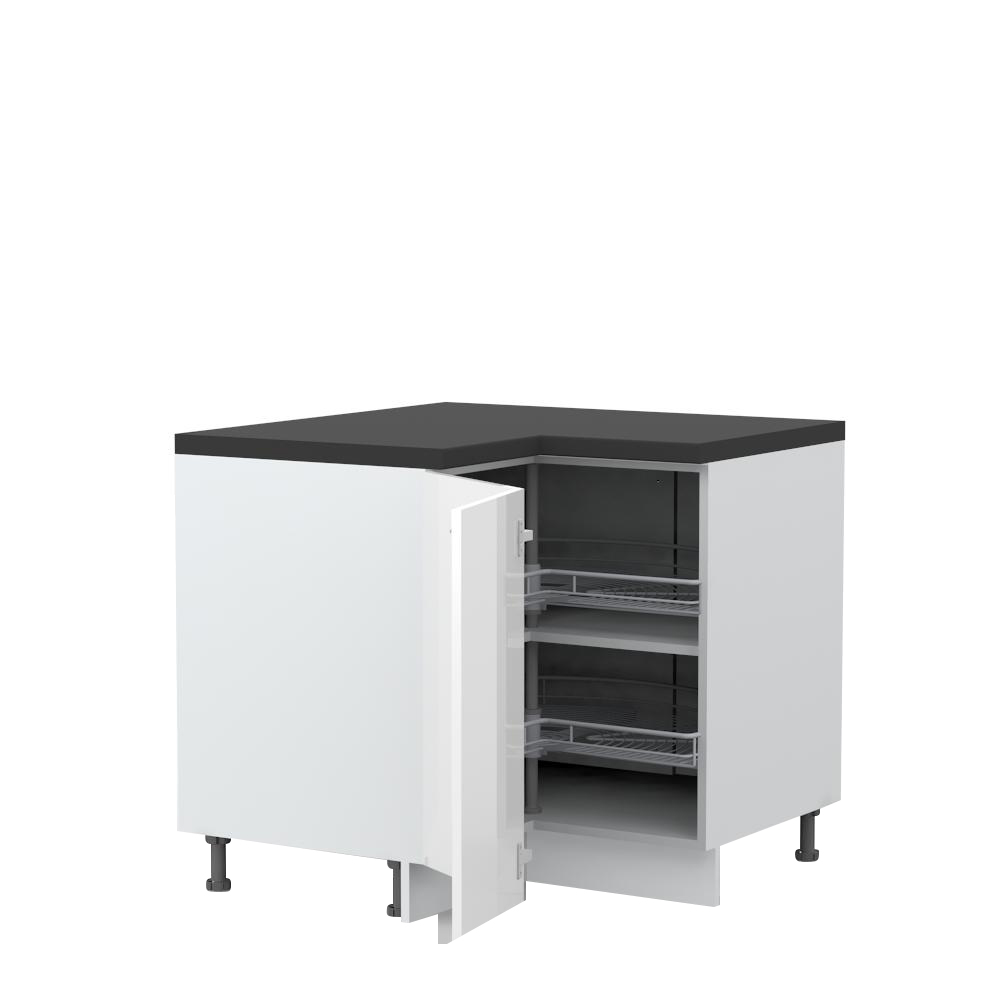 Radni ugaoni kuhinjski element sa dva krila i sa dve hromirane rotirajuće žičane korpe za odlaganje.