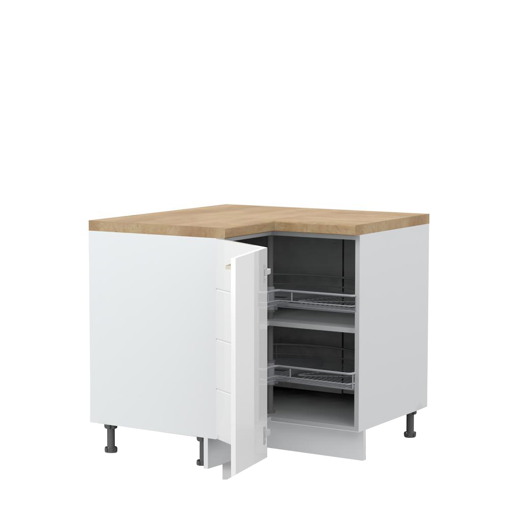 Radni ugaoni kuhinjski element sa dva krila i sa dve hromirane rotirajuće žičane korpe za odlaganje.