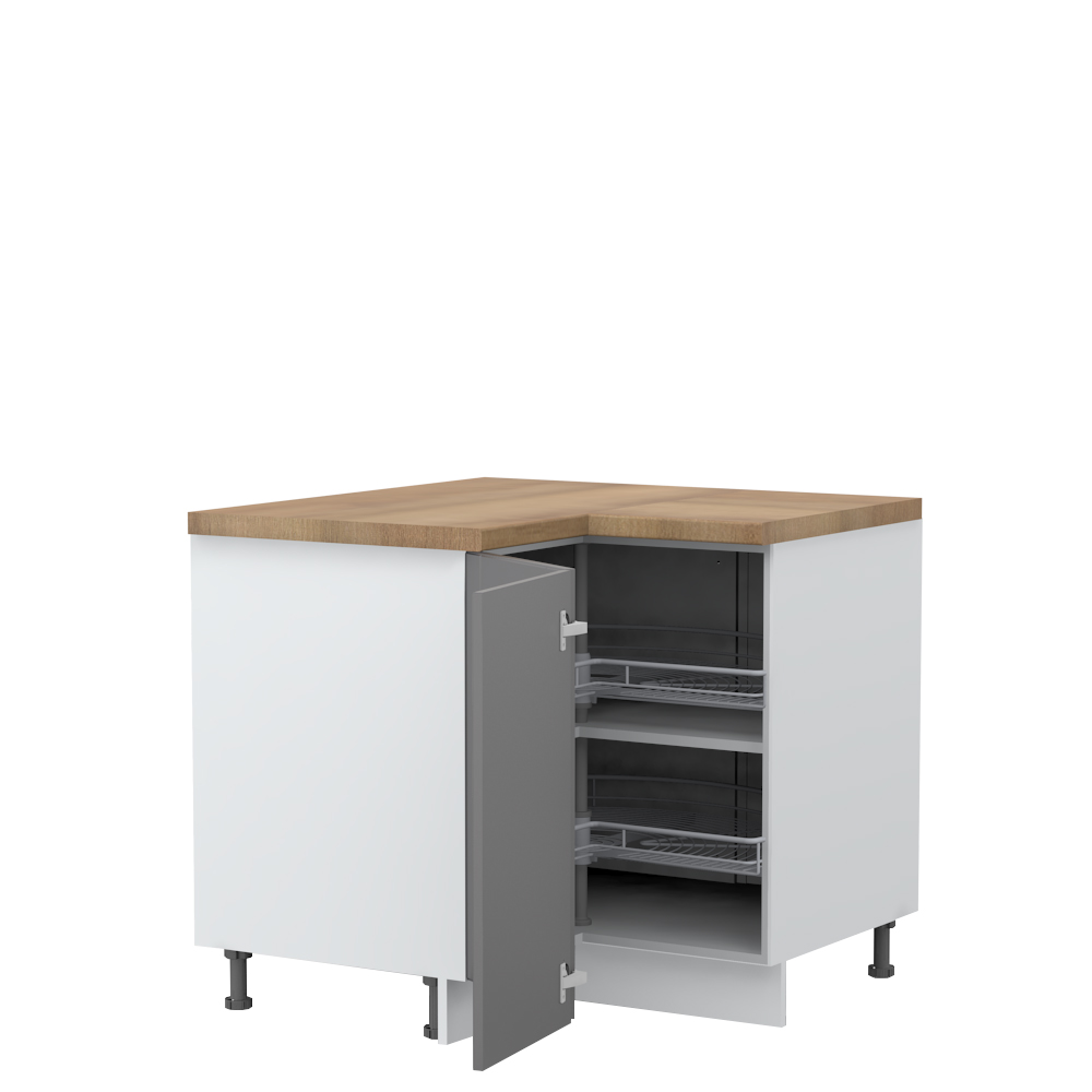 Radni ugaoni kuhinjski element sa dva krila i sa dve hromirane rotirajuće žičane korpe za odlaganje.