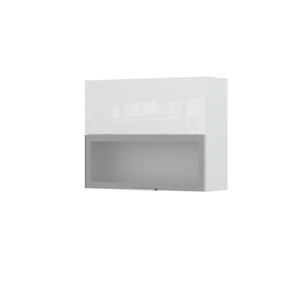 Viseći kuhinjski element, širine 90cm, sa jednim punim krilom lakiranim UV lakom u visokom sjaju ,u boji prema Vašem izboru iz ponuđene palete boja ovog modela, i jednim krilom sa kaljenim staklom debljine 4mm u ramu od poliranog aluminijuma sa pripadajućom ručicom koja je uključena u cenu proizvoda. UV napredna tehnologija lakiranja omogućuje četiri puta otporniju površinu fronta na fizička oštećenja i habanje u odnosu na standardno lakiranje. Korpus elementa izrađen je od univera debljine 18mm, u belom drvo dekoru. Dubina elementa je 32cm. Korpus elementa je kantovan sa zadnje strane. Kesseböhmer, preklopni mehanizam nemačkog proizvođača pruža komfor pri rukovanju, omogućuje dobar pristup unutrašnjosti elementa i ima lako i tiho zatvaranje. U cenu proizvoda uračunat je jedan fah i šina za postavljanje i lakše nivelisanje elementa. Ukoliko želite, uz izbor dodatne opreme, bele bočne stranice možete zameniti bočnim panelima lakiranim UV lakom u boji prema Vašem izboru iz ponuđene palete boja ovog modela ili od univera u drvo dekoru Nebraska hrast. Istaknite završne bočne strane kuhinje ugradnjom dodatnih panela, debljine 16mm, lakiranih UV lakom u visokom sjaju u boji prema Vašem izboru iz ponuđene palete boja ovog modela ili ugradnjom dodatnih panela od univera debljine 25mm, dostupnim u drvo dekorima bele boje i Nebraska hrast.