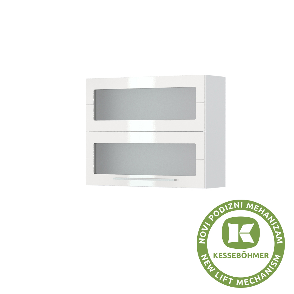 Viseći kuhinjski element sa dva staklena krila sa preklopnim otvaranjem i jednim fahom, širine 90 cm.