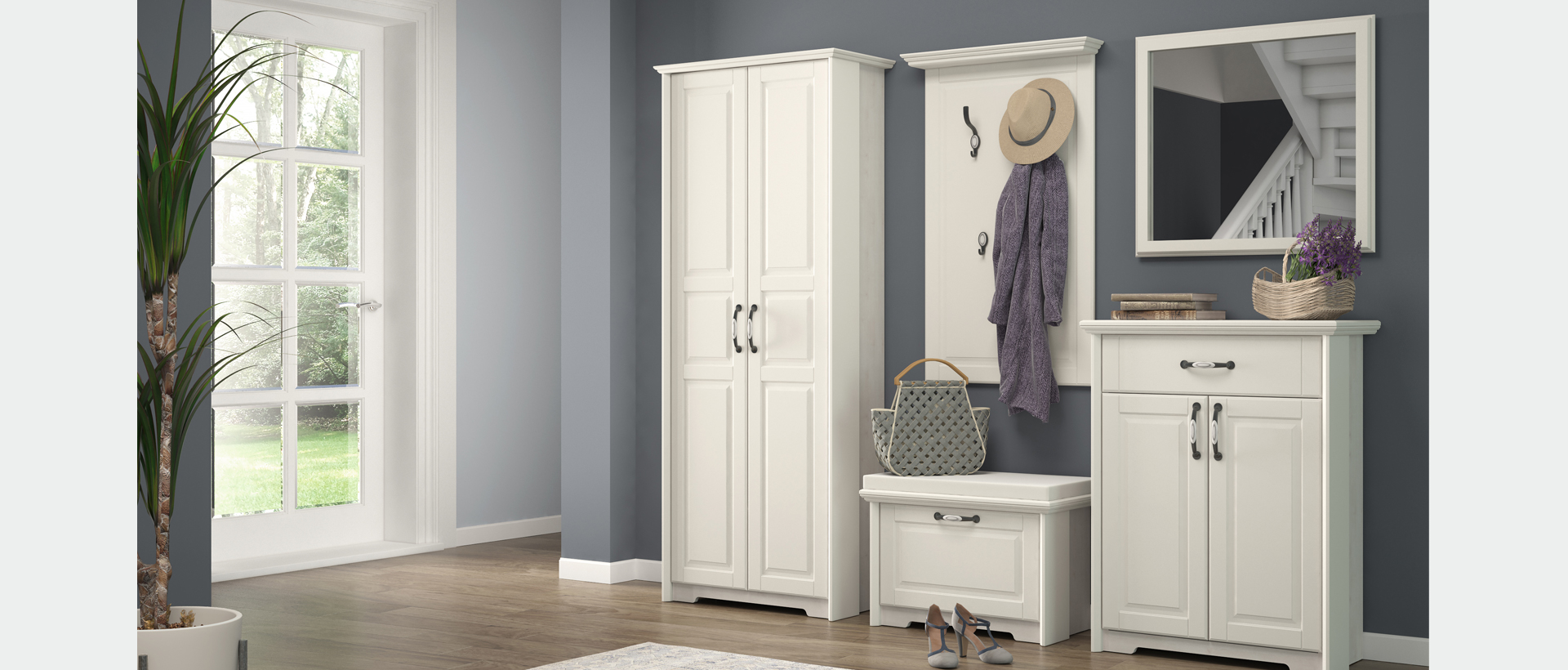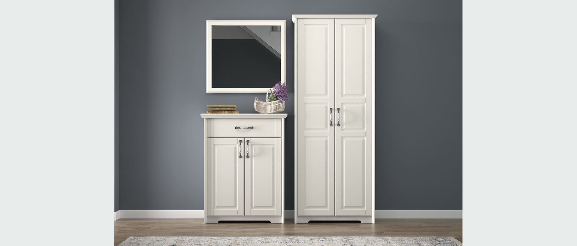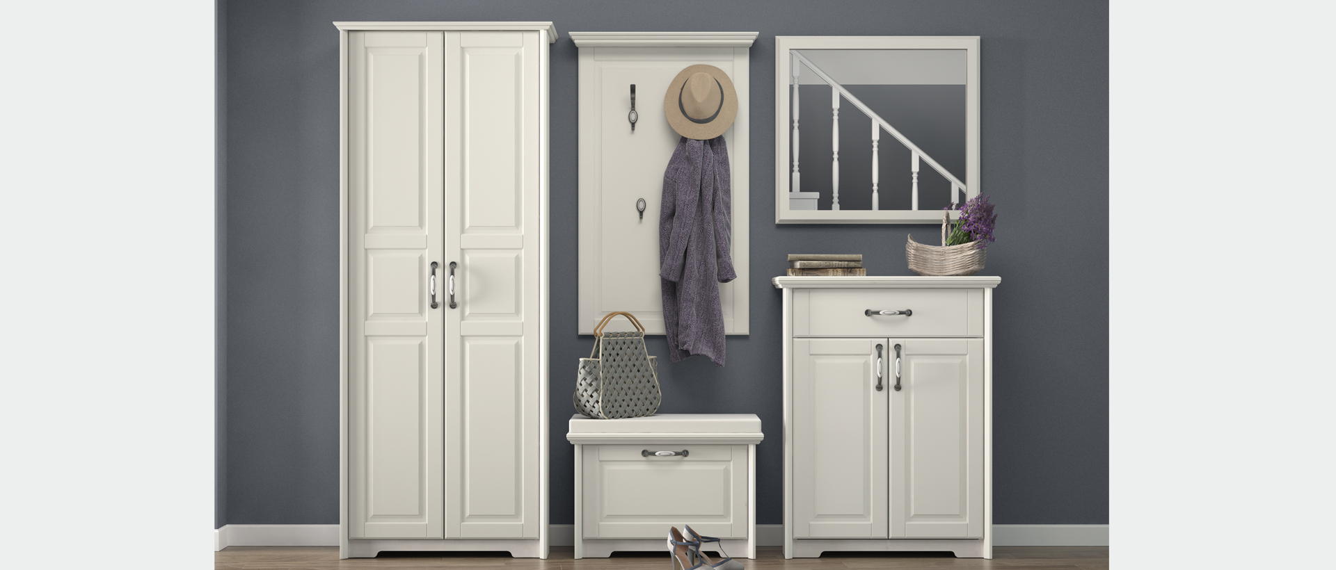 Predsoblje Evergreen od medijapana u kombinaciji tople boje slonove kosti i dekora polarnog bora