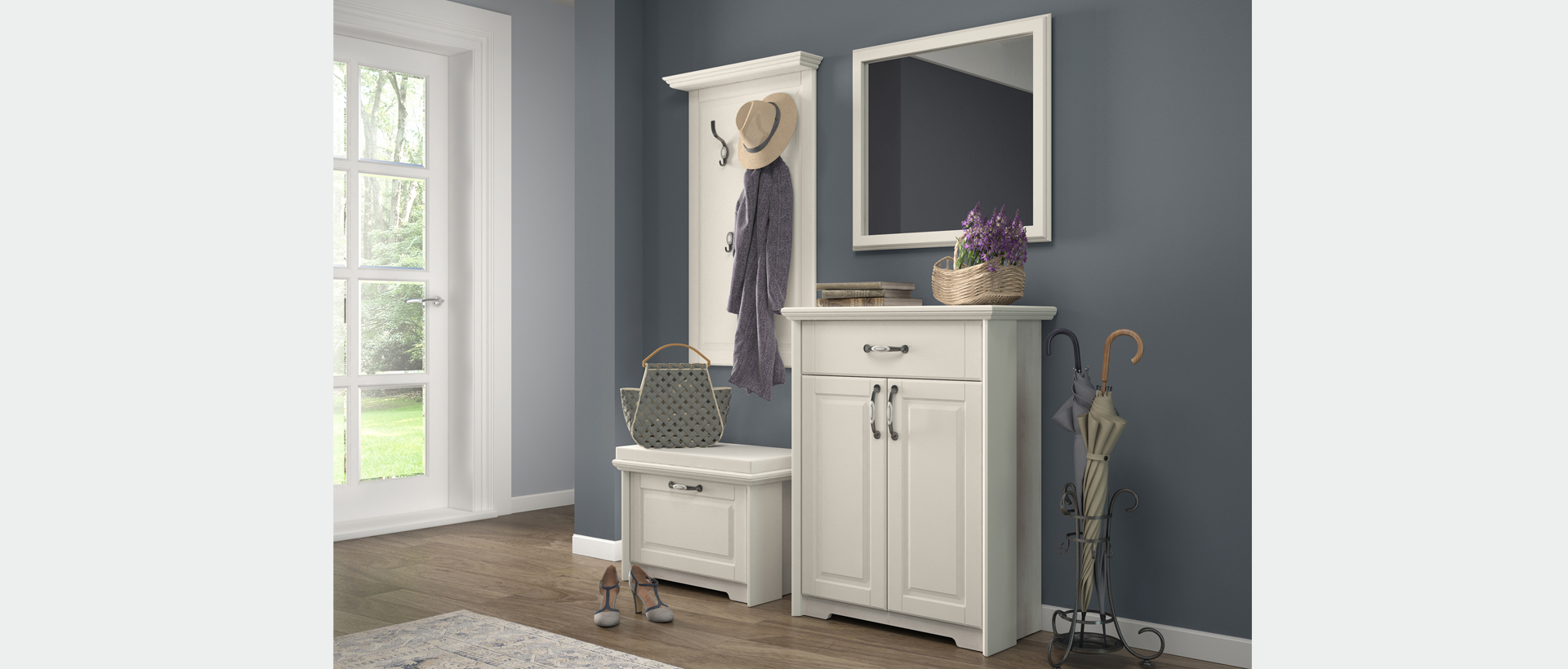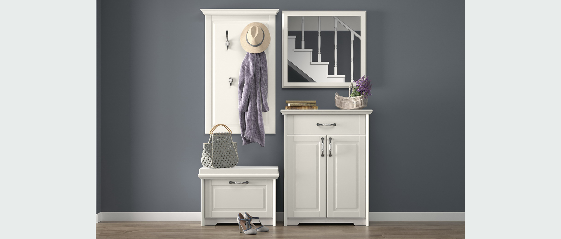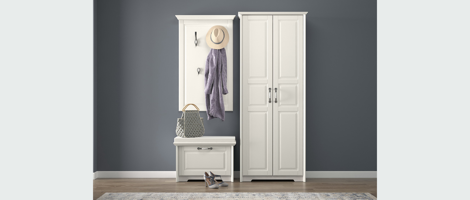 Predsoblje Evergreen od medijapana u kombinaciji tople boje slonove kosti i dekora polarnog bora