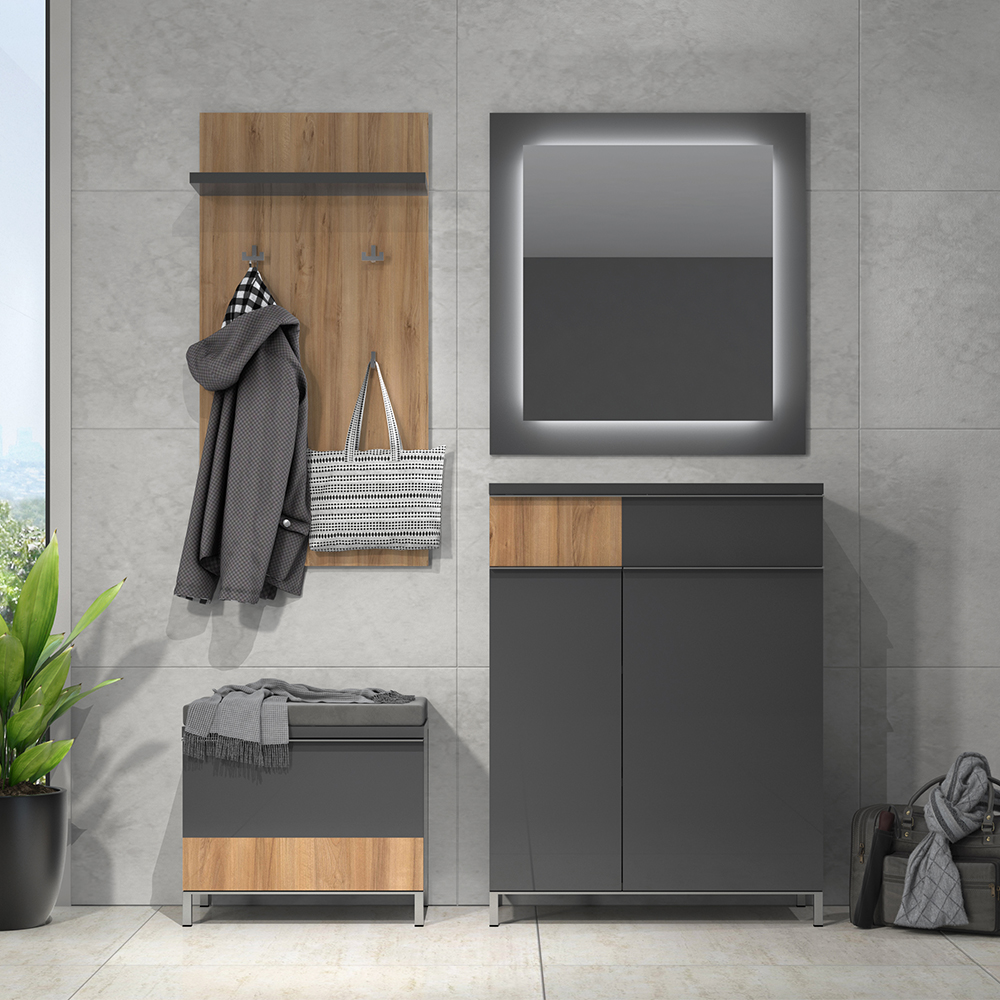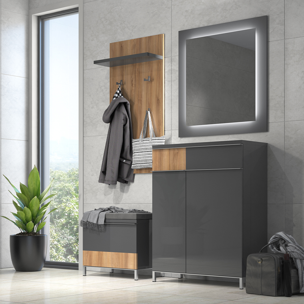 • element je lakiran UV lakom u visokom sjaju u drvodekoru Pacifik orah, sa policom u atraktivnoj Antracit boji;