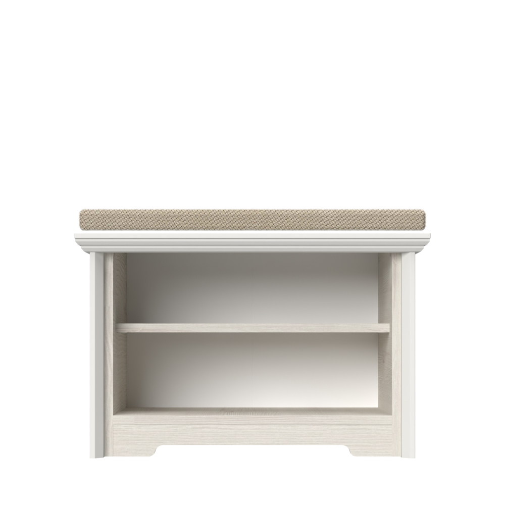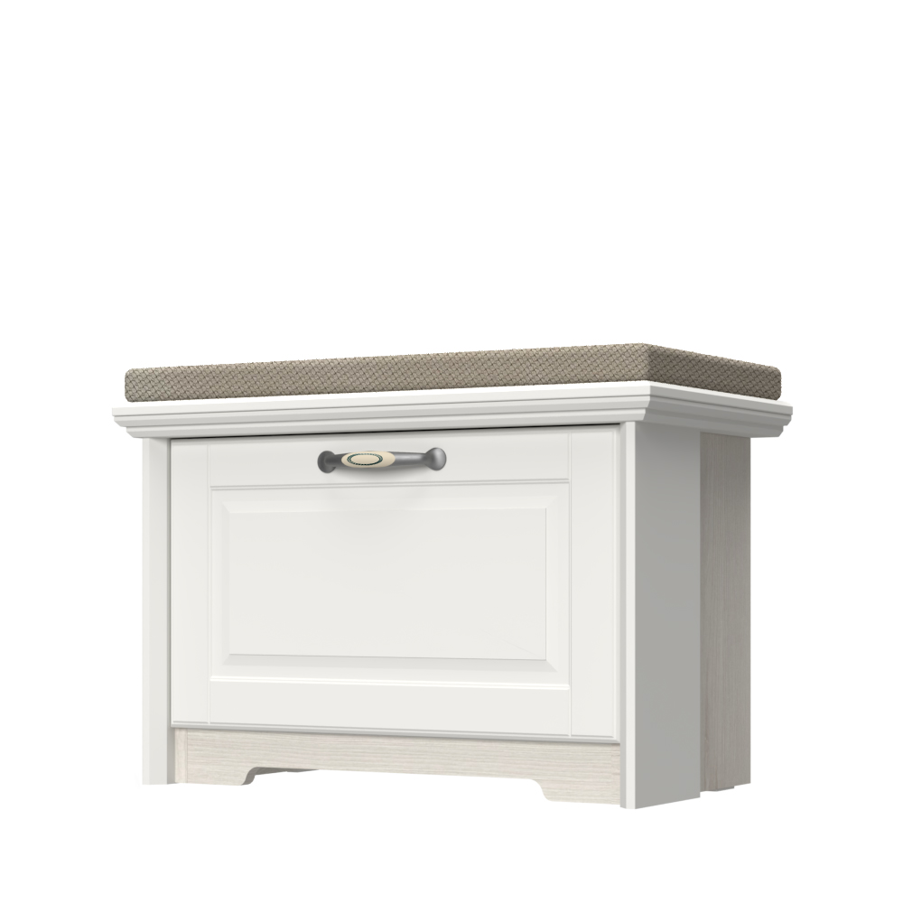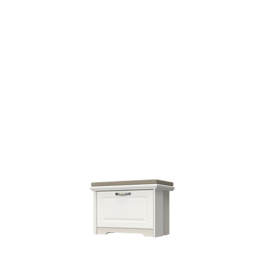 Komoda za predsoblje iz kolekcije EVERGREEN sa jednim krilom i tapaciranim jastukom za sedenje – element nameštaja za ljubitelje klasike.