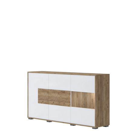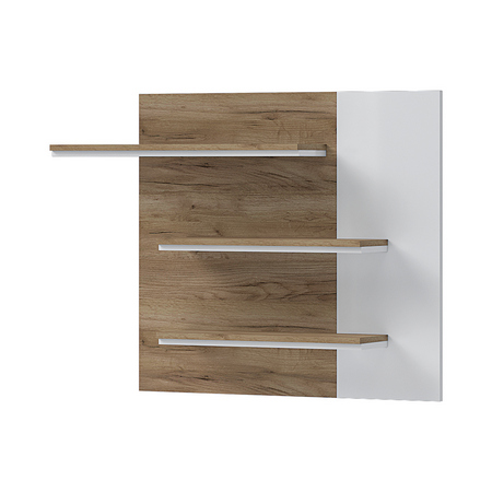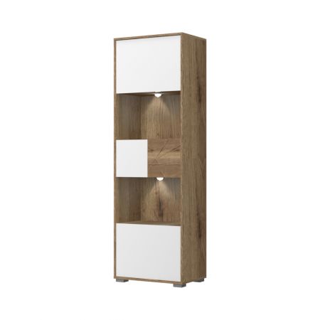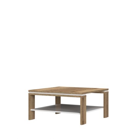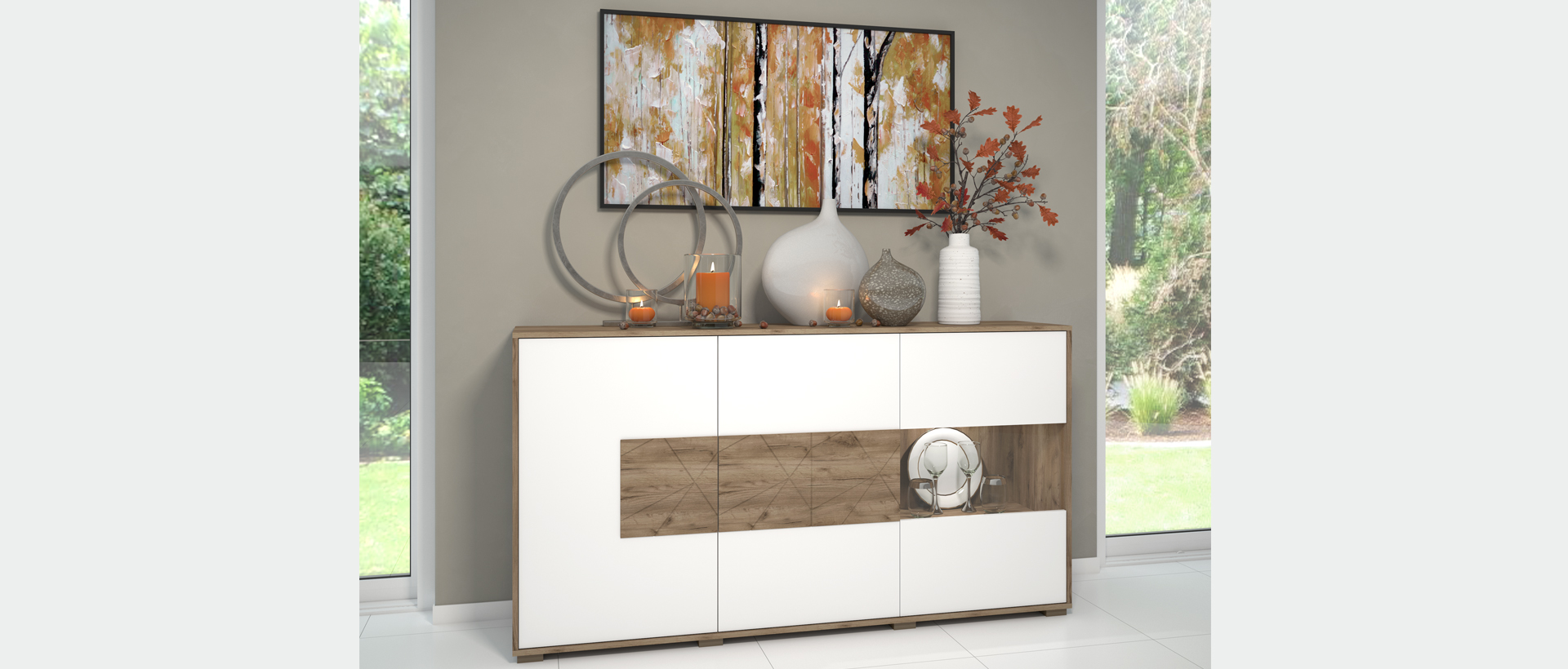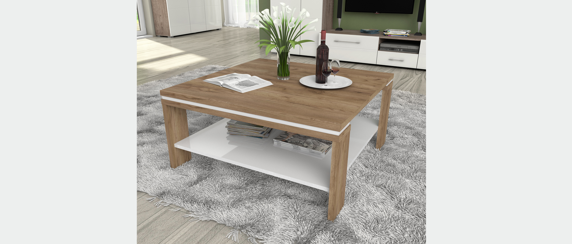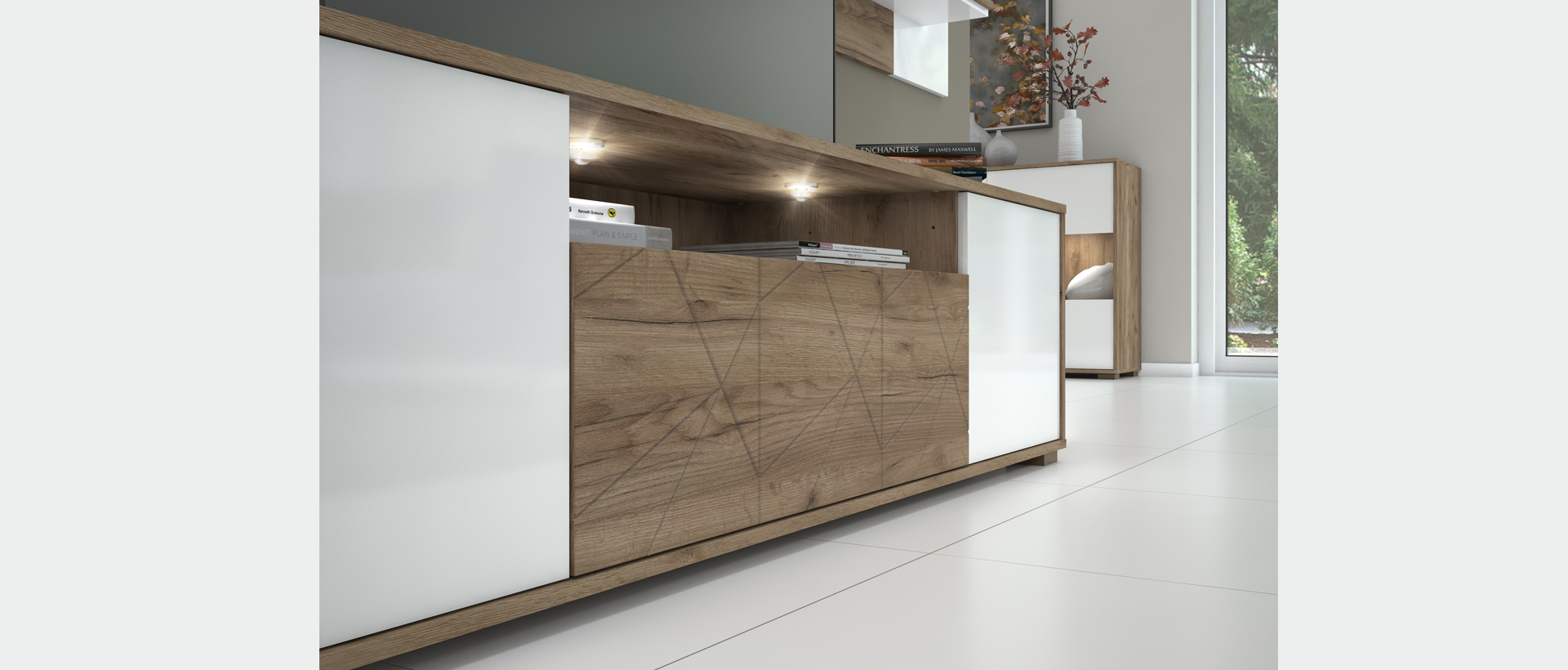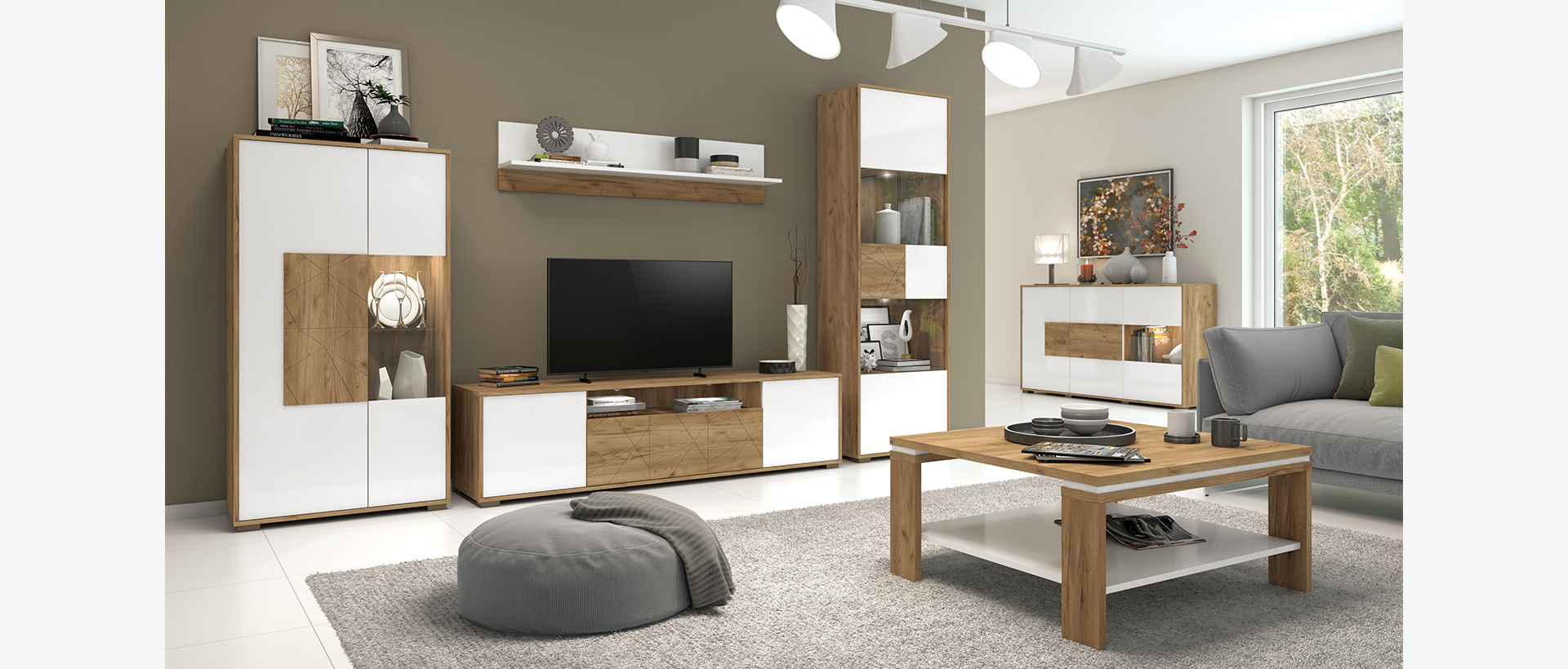 Dnevna soba Stela sa frontovima lakiranim UV lakom bele boje u visokom sjaju i korpusom u decoru Tobacco hrasta