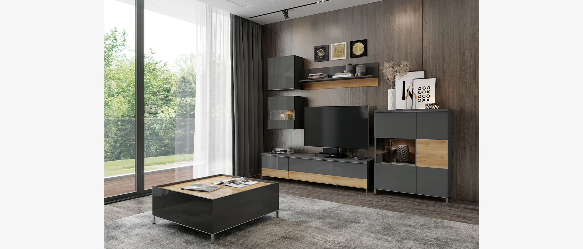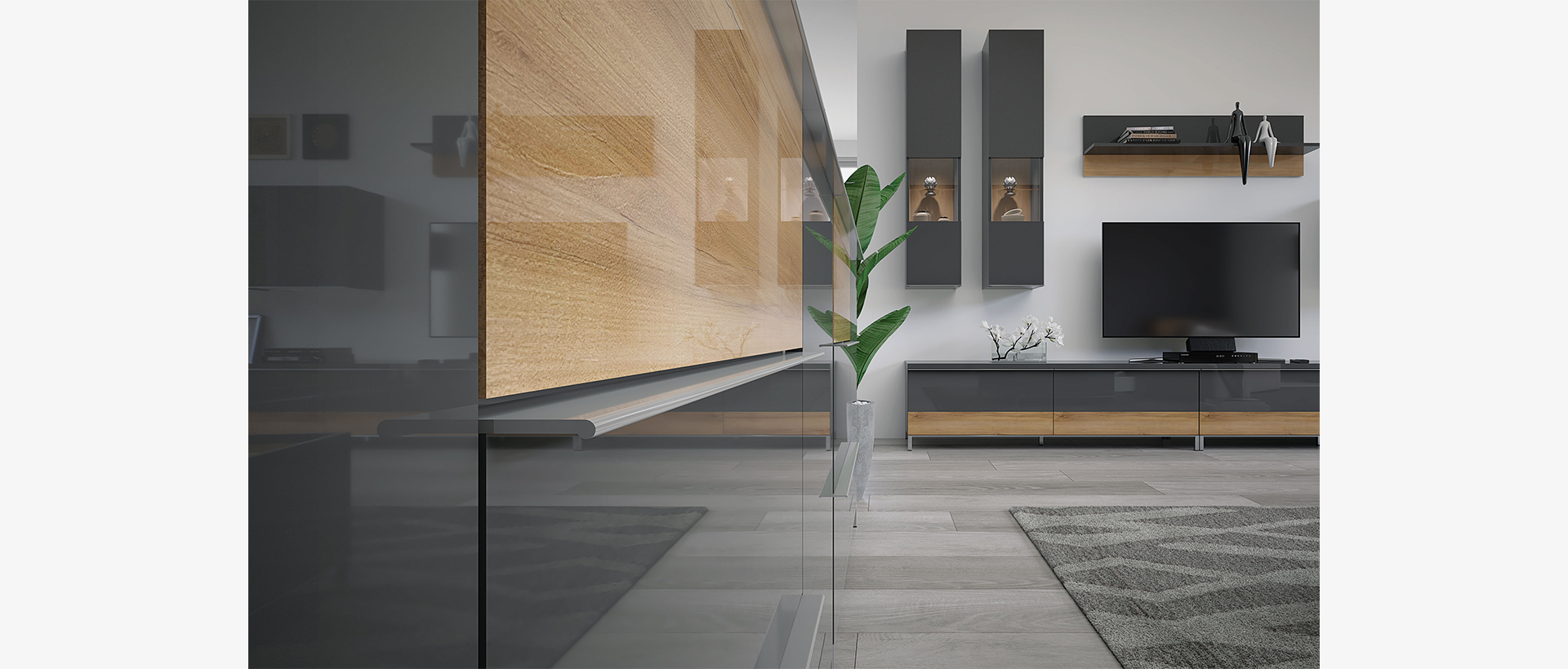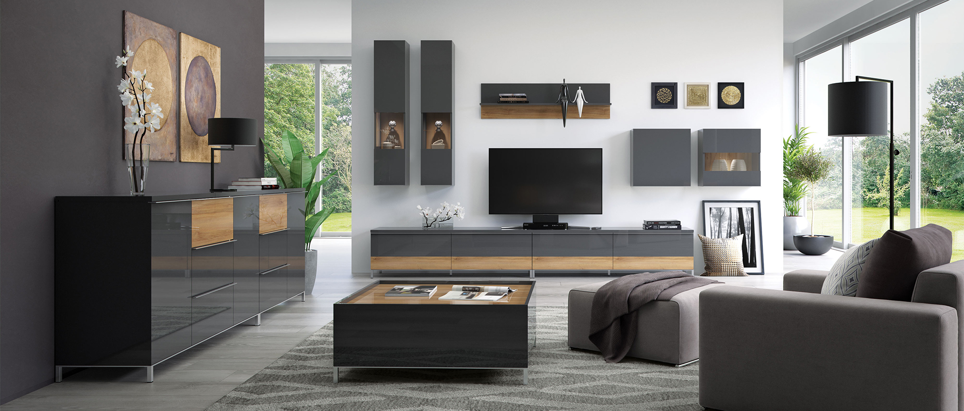 Dnevna soba Onyx lakirana UV lakom visokog sjaja u Antracit sivoj boji i drvo dekoru Pacifik orah