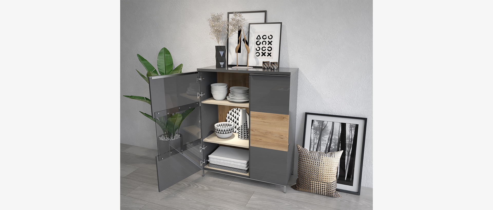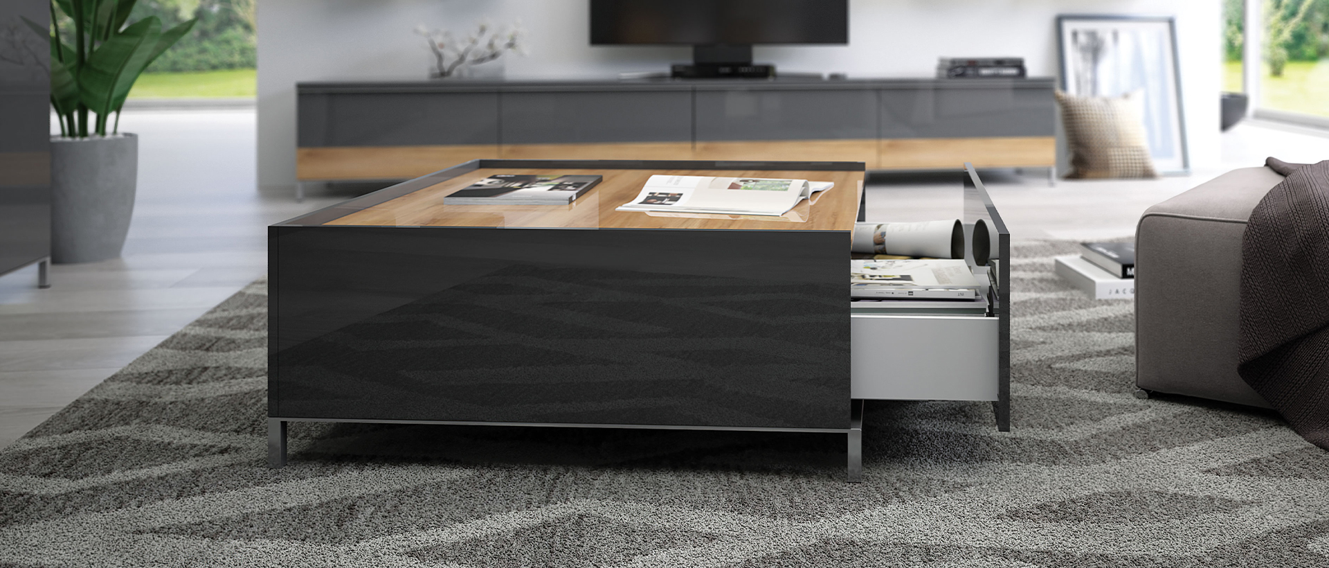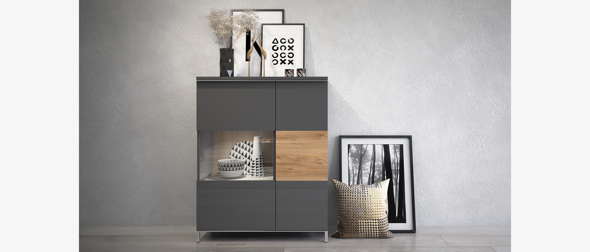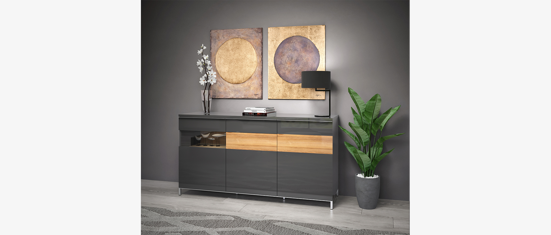 Dnevna soba Onyx lakirana UV lakom visokog sjaja u Antracit sivoj boji i drvo dekoru Pacifik orah