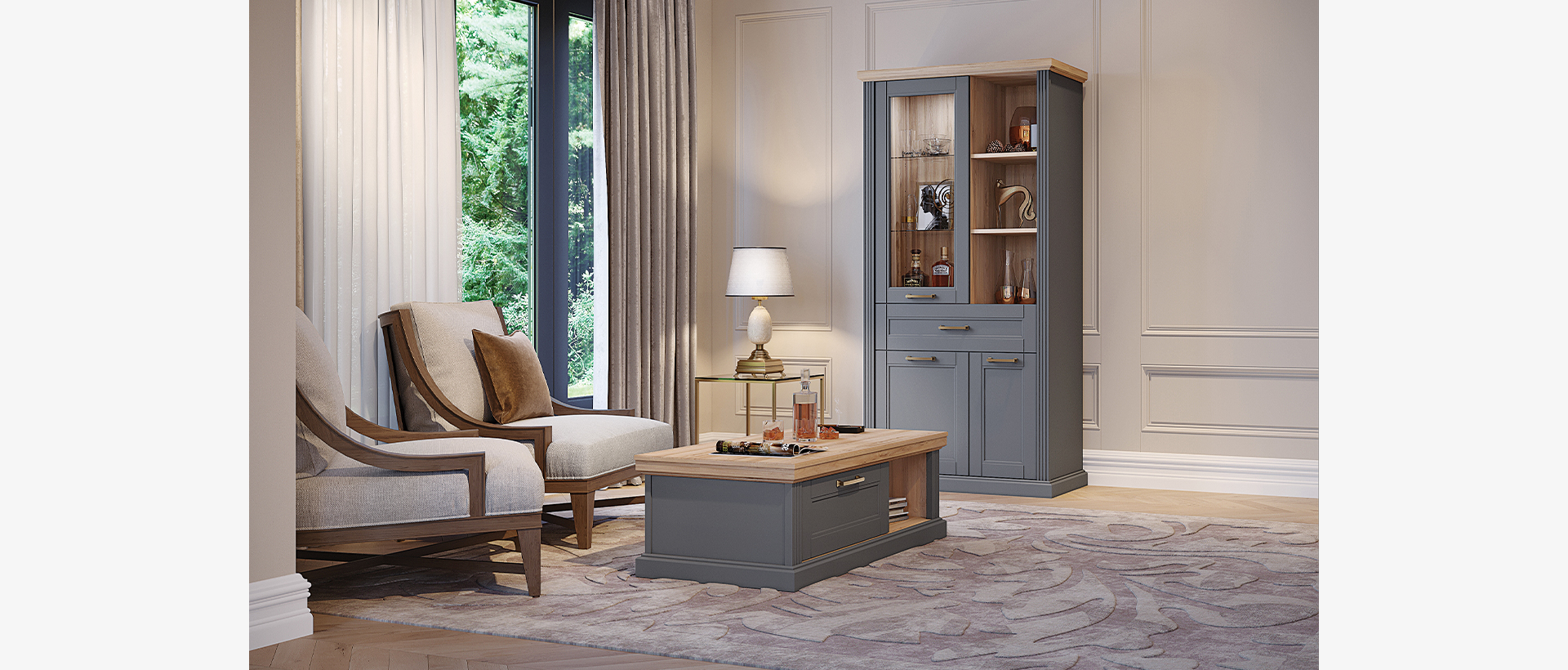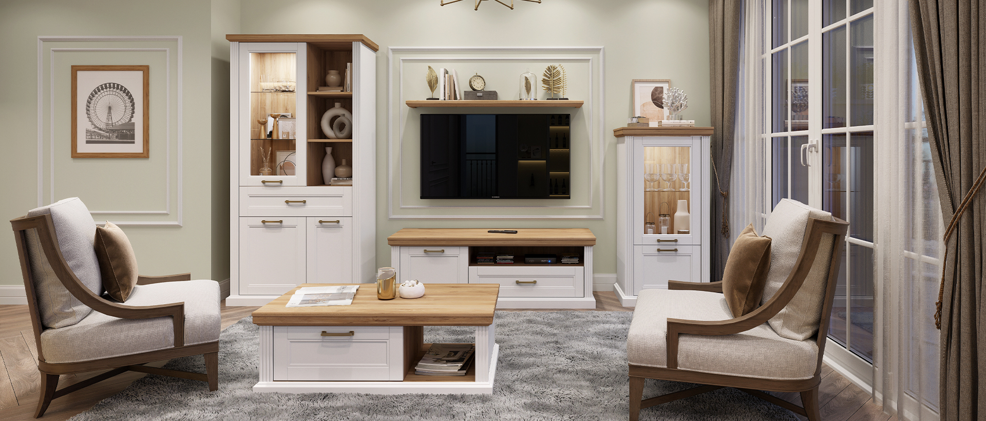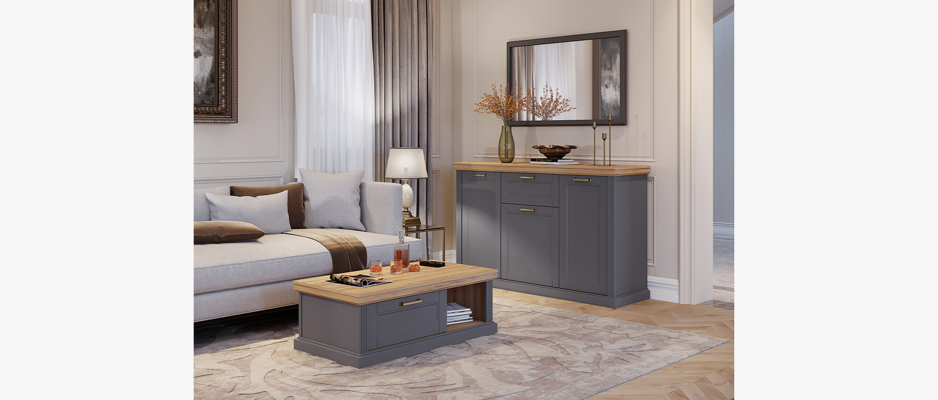 Dnevna soba Tara lakirana UV mat lakom u grafit sivoj ili beloj boji u kombinaciji sa drvo dekorom Pacifik orah