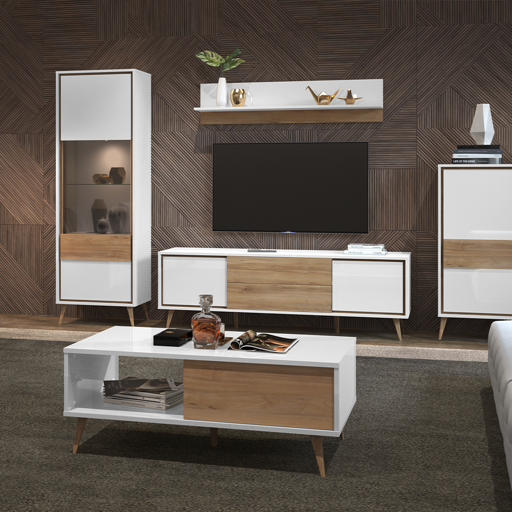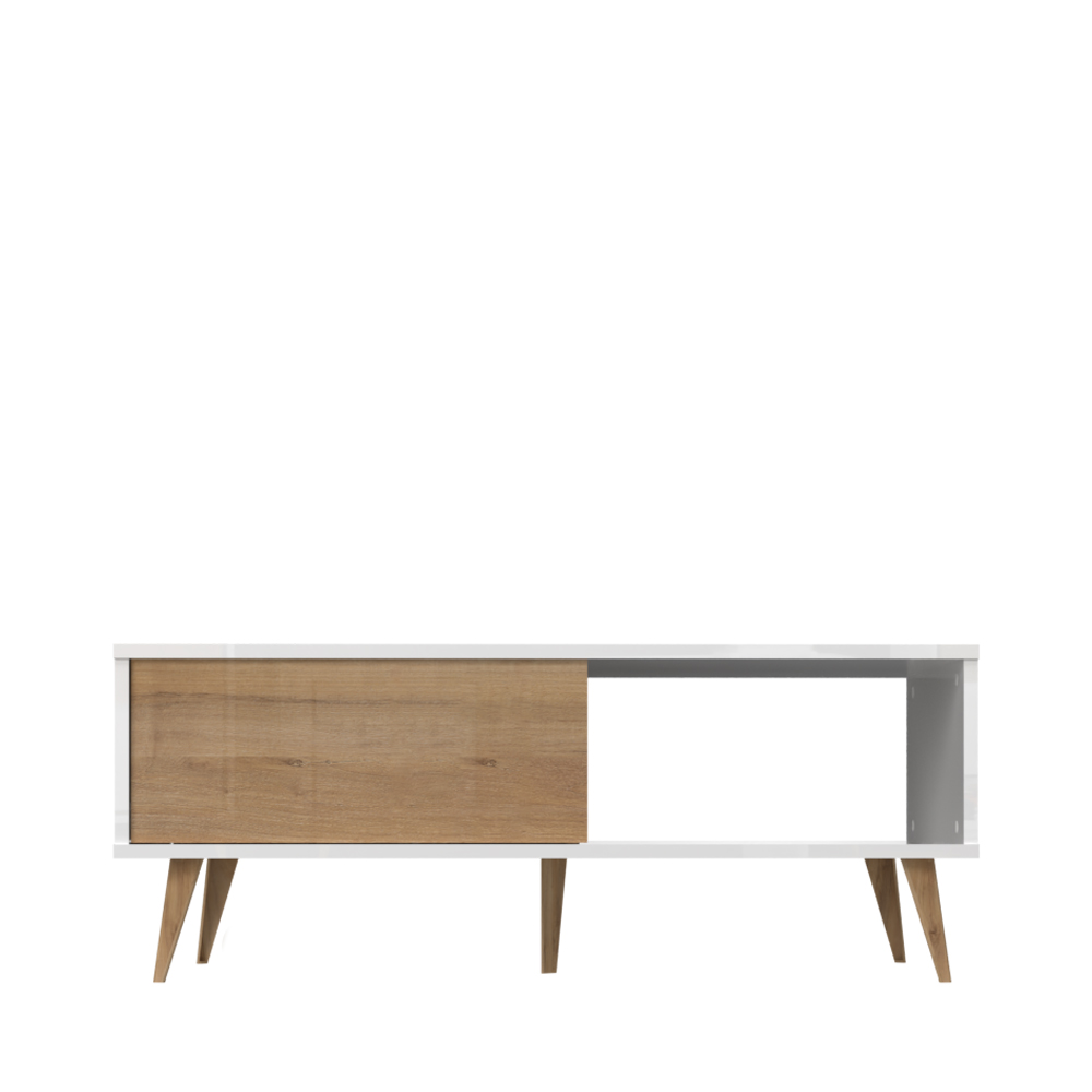 Klub sto za dnevnu sobu, iz kolekcije VIDA, u kristalno beloj boji sa frontovima fioke u drvo-dekoru Pacifik orah. Ovaj komad nameštaja uneće duh 60-ih godina u vašu dnevnu sobu.