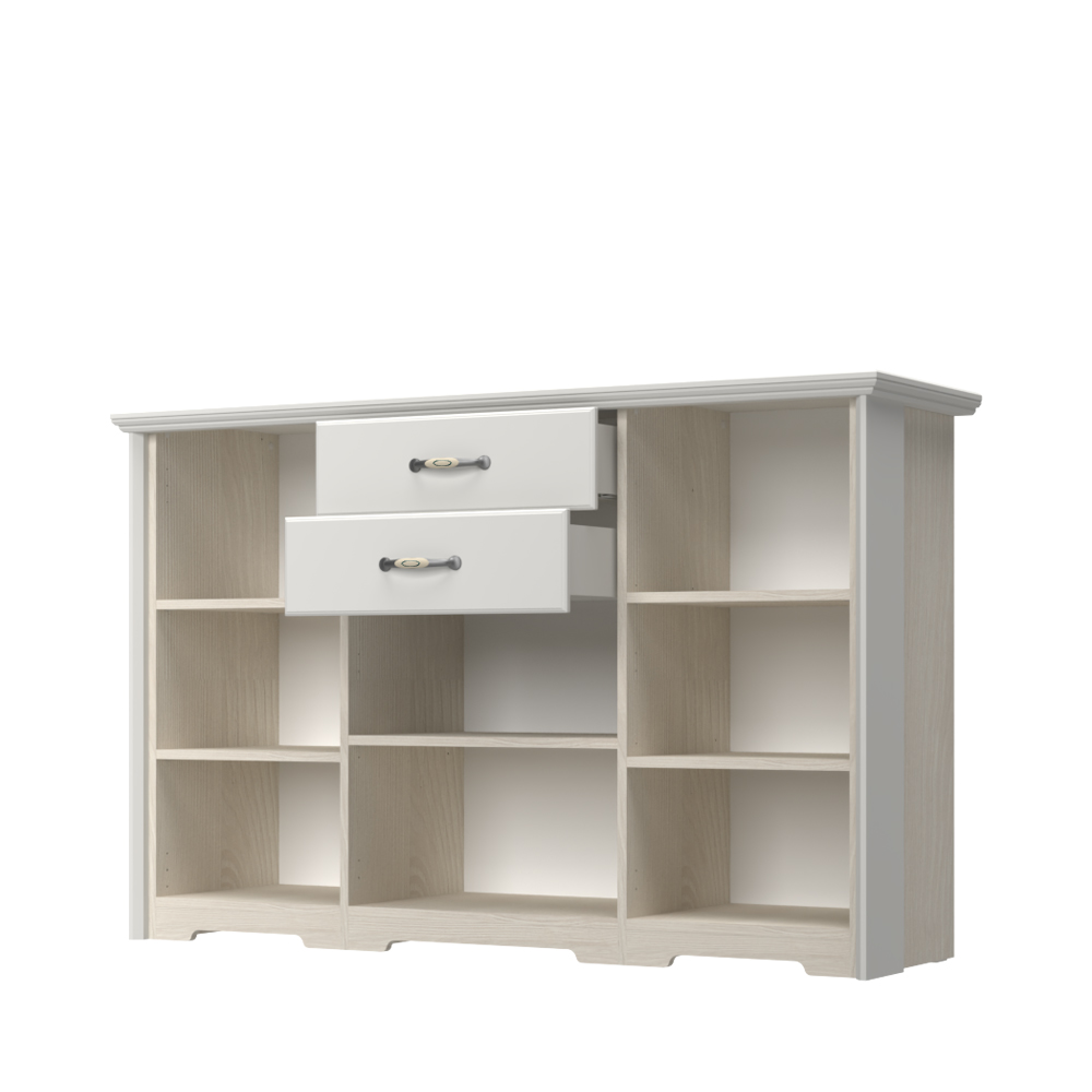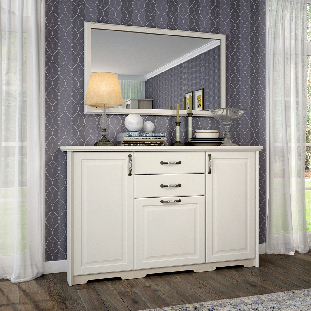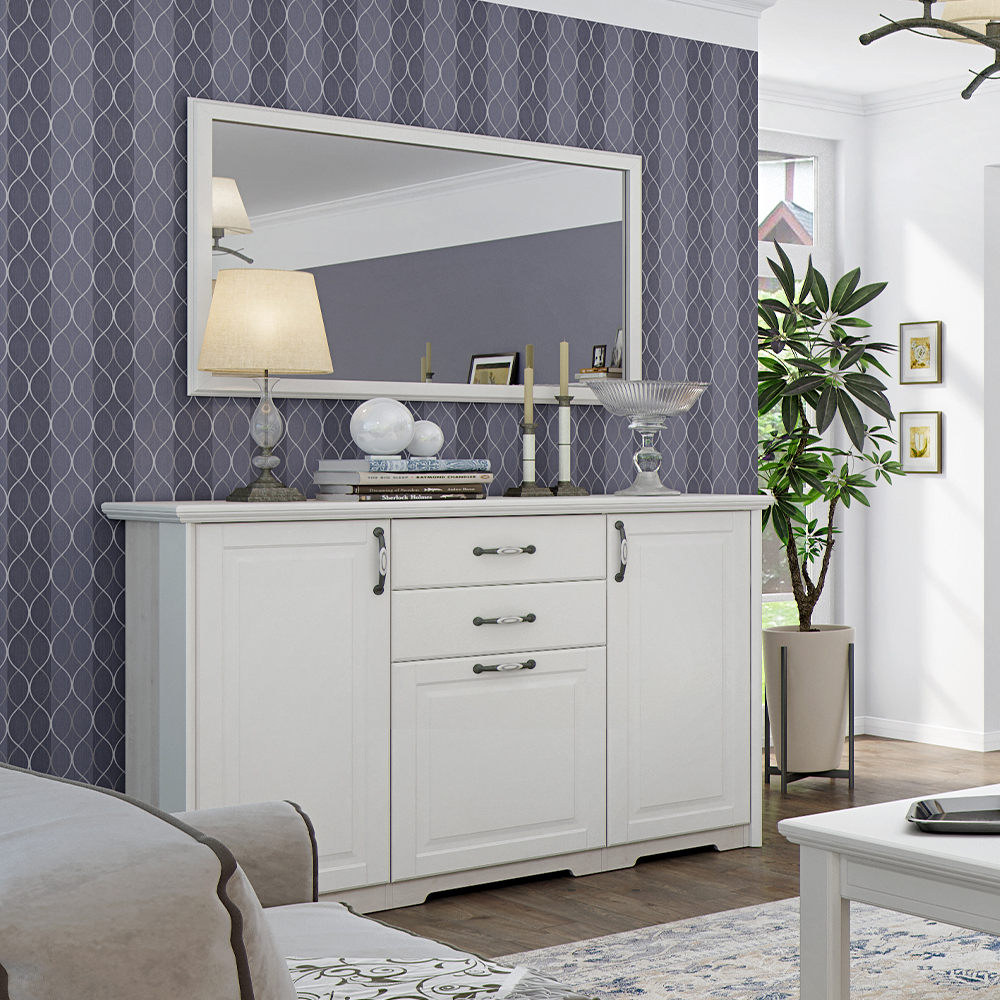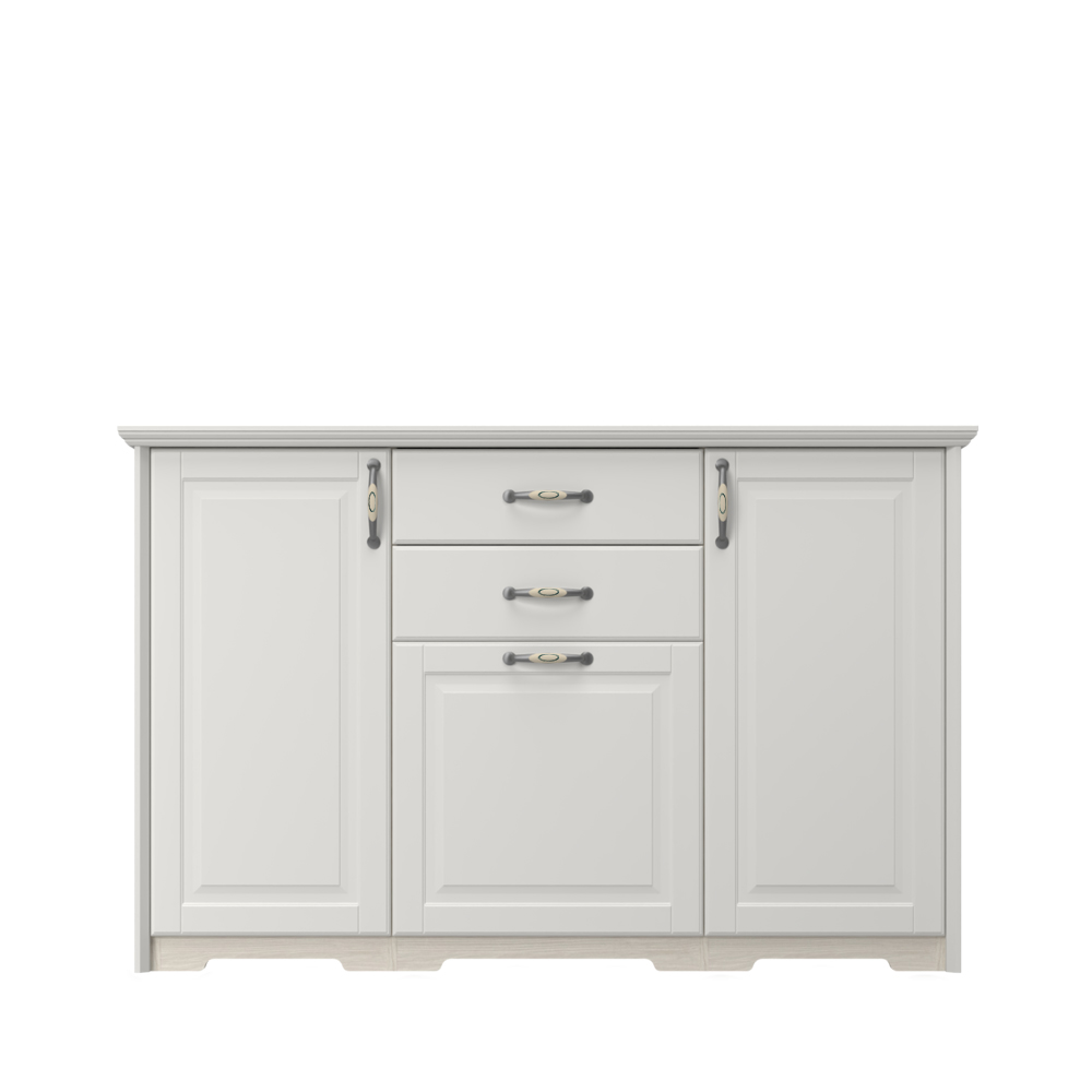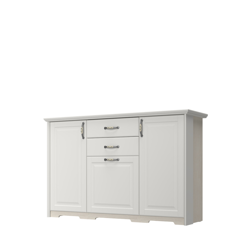 Rustična, funkcionalna i stilizovana komoda za dnevnu sobu ili trpezariju, iz kolekcije EVERGREEN, sa tri krila i dve fioke.