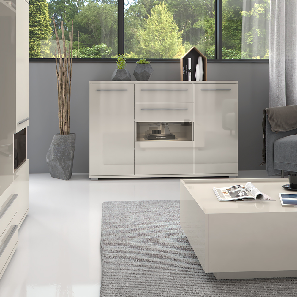 Funkcionalna komoda iz kolekcije nameštaja PIANO sa dva puna, jednim staklenim krilom I jednom fiokom, dizajnirane geometrijske forme.