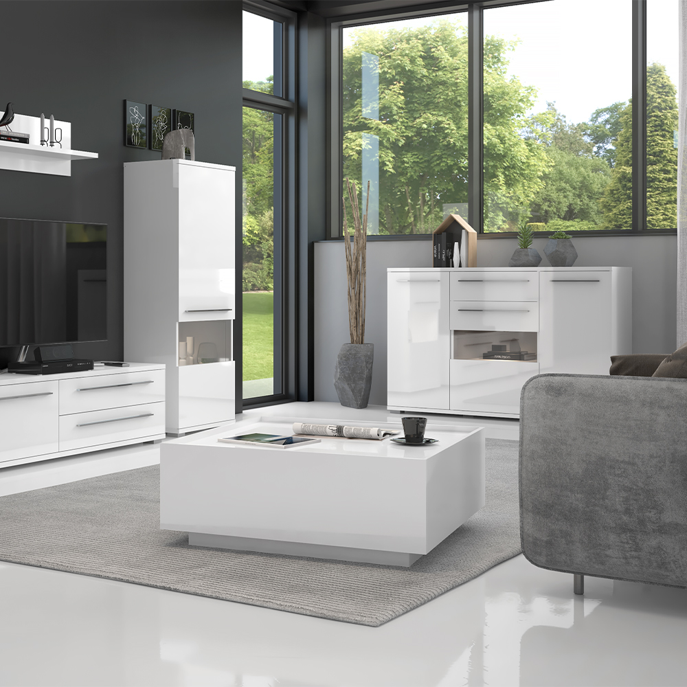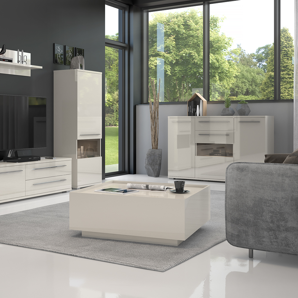 - frontovi, bočne strane i plafon elementa lakirani su UV lakom u visokom sjaju, u toploj bež ili kristalno beloj boji boji