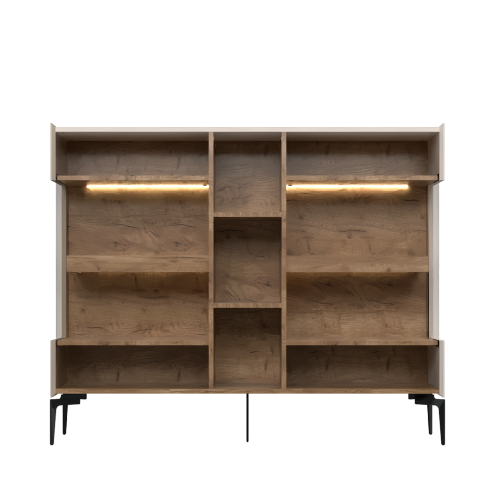 • masivne police unutar elemenata sa skrivenom LED rasvetom i punim leđima u drvo-dekoru Tobacco hrast kao i parsol staklo u braon boji, daju ovoj komodi jedinstveni izgled