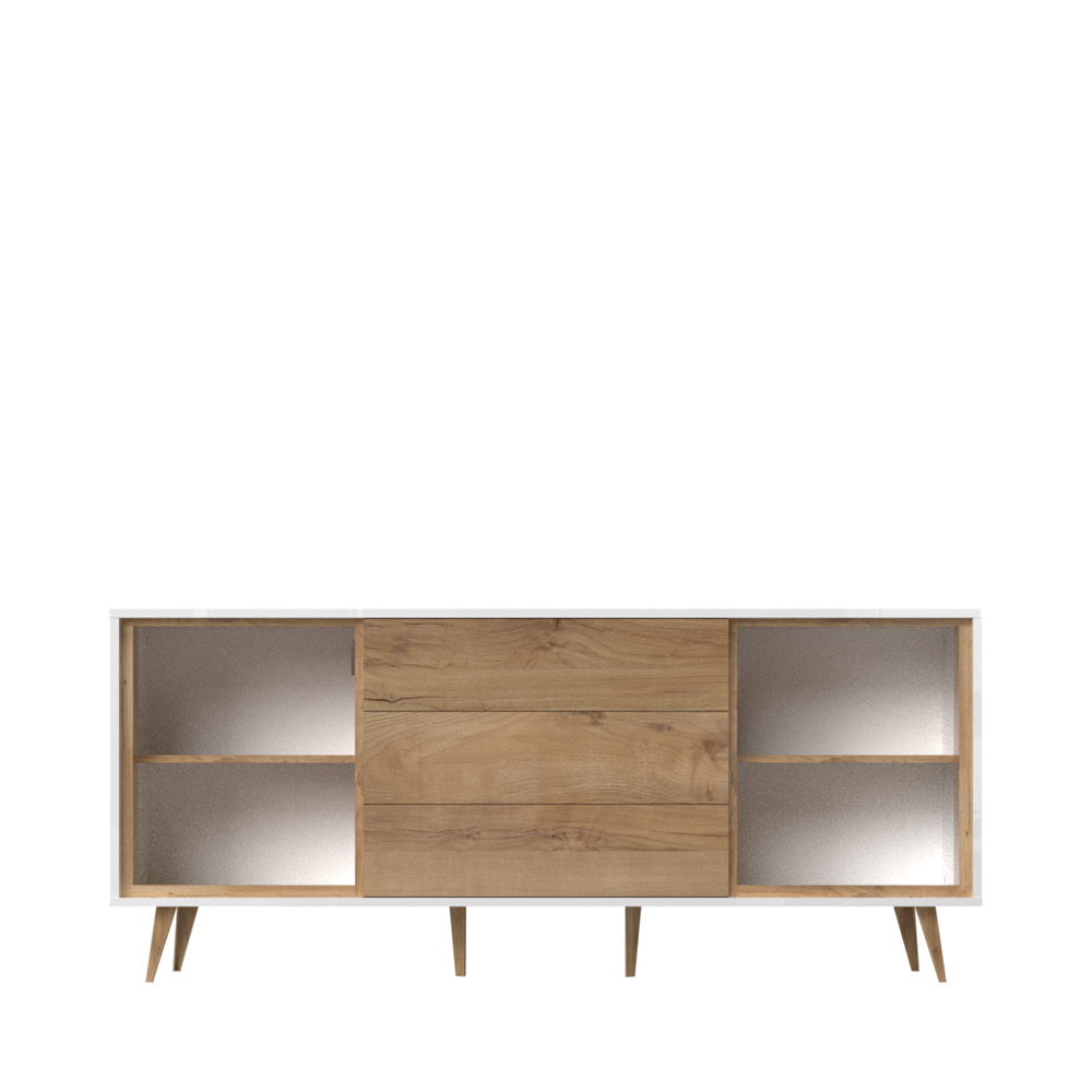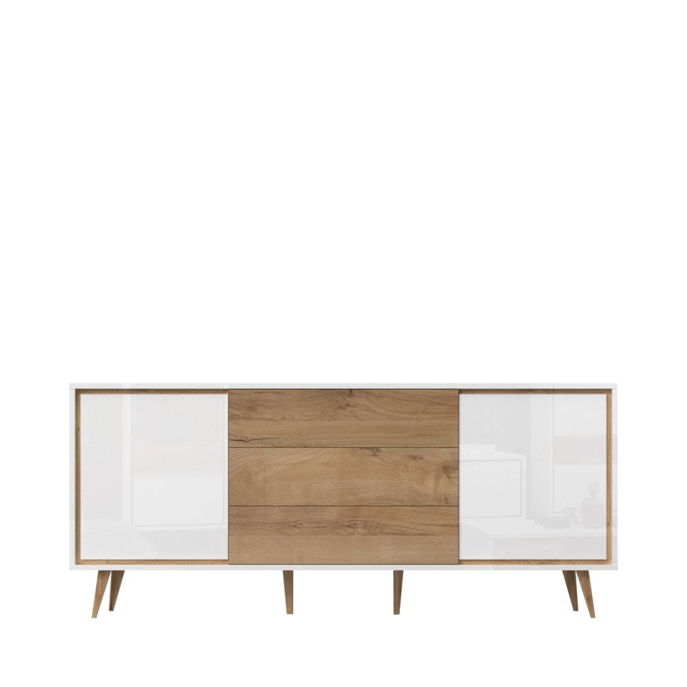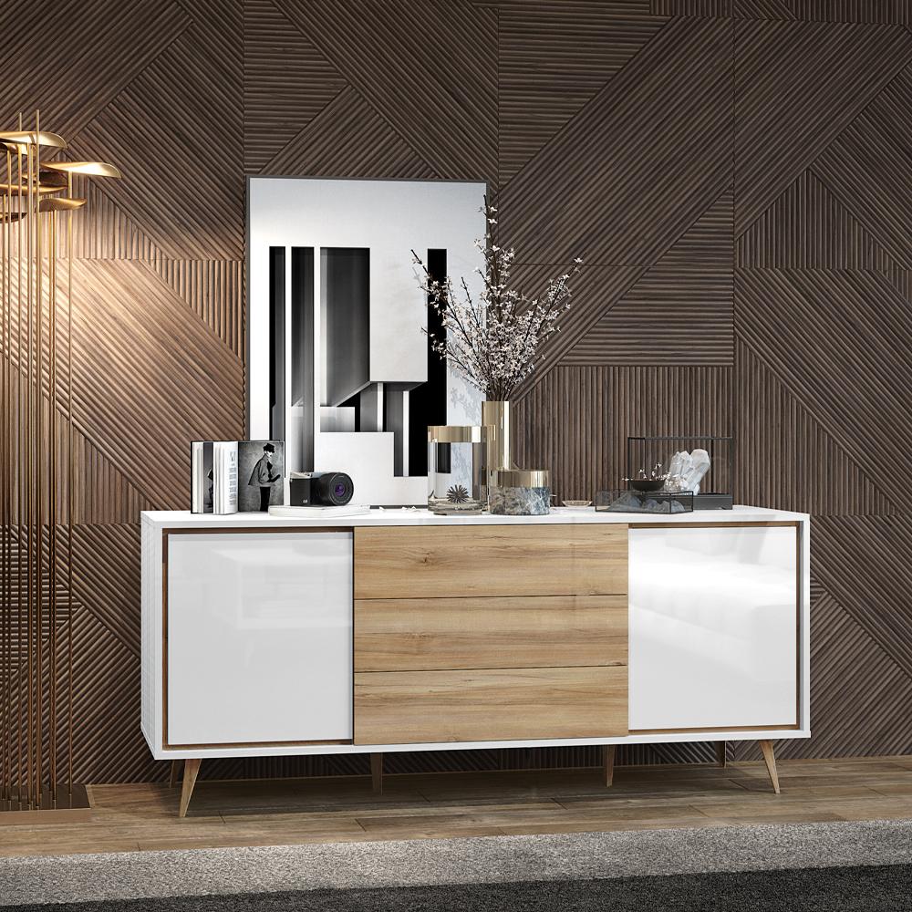 Komoda iz kolekcije VIDA, sa dva krila u kristalno beloj boji i tri fioke u drvo-dekoru Pacifik orah, dizajnirana je u stilu 60-tih godina. Ova komoda namenjena je ljubitelima nameštaja retro dizajna.