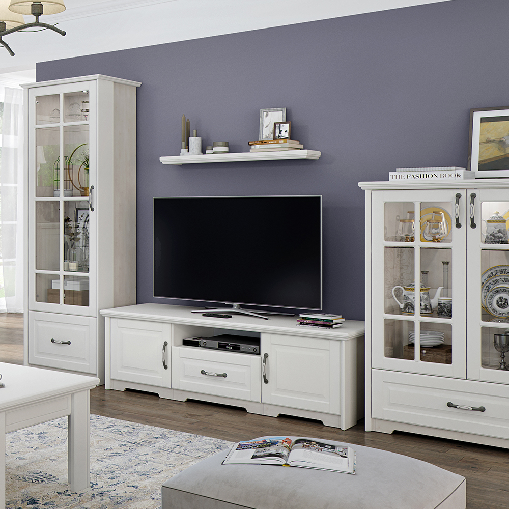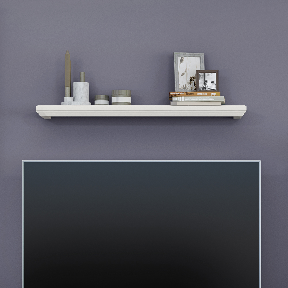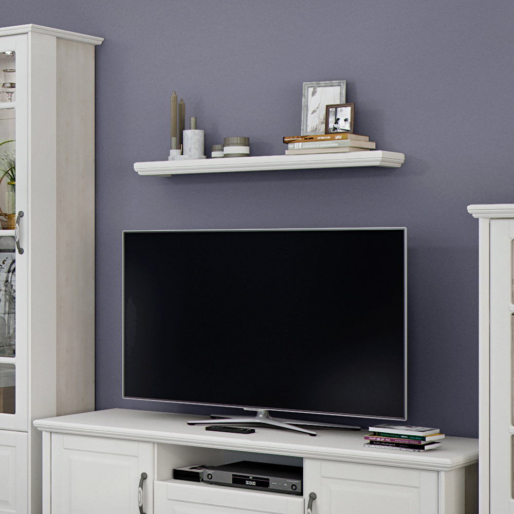 Viseća polica za dnevnu sobu, iz kolekcije EVERGREEN, sa dekorativnim lajsnama i pločom od medijapana u toploj boji Slonova kost – element nameštaja za ljubitelje klasike.