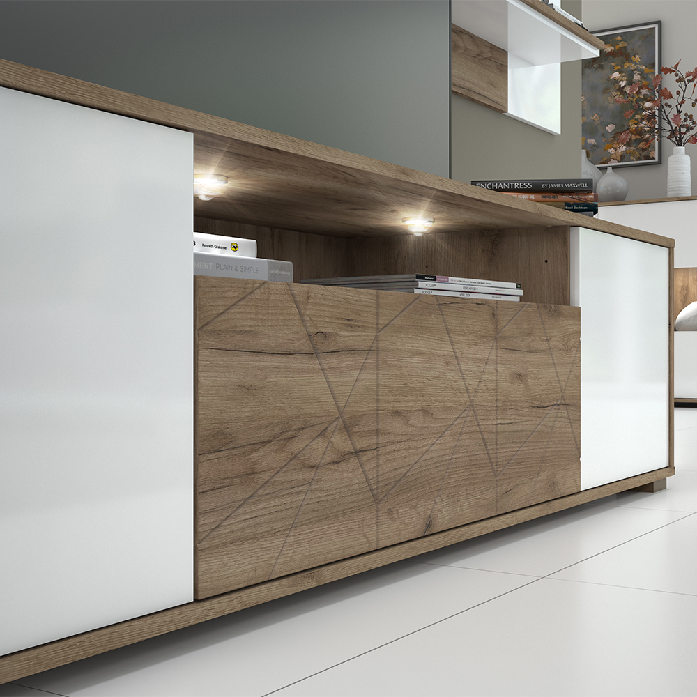 - dva faha u drvo-dekoru Tobacco hrast, podesive nožice za nivelisanje na neravnim površinama, kao i LED osvetljenje snage 0,6W, uračunati su u cenu elementa